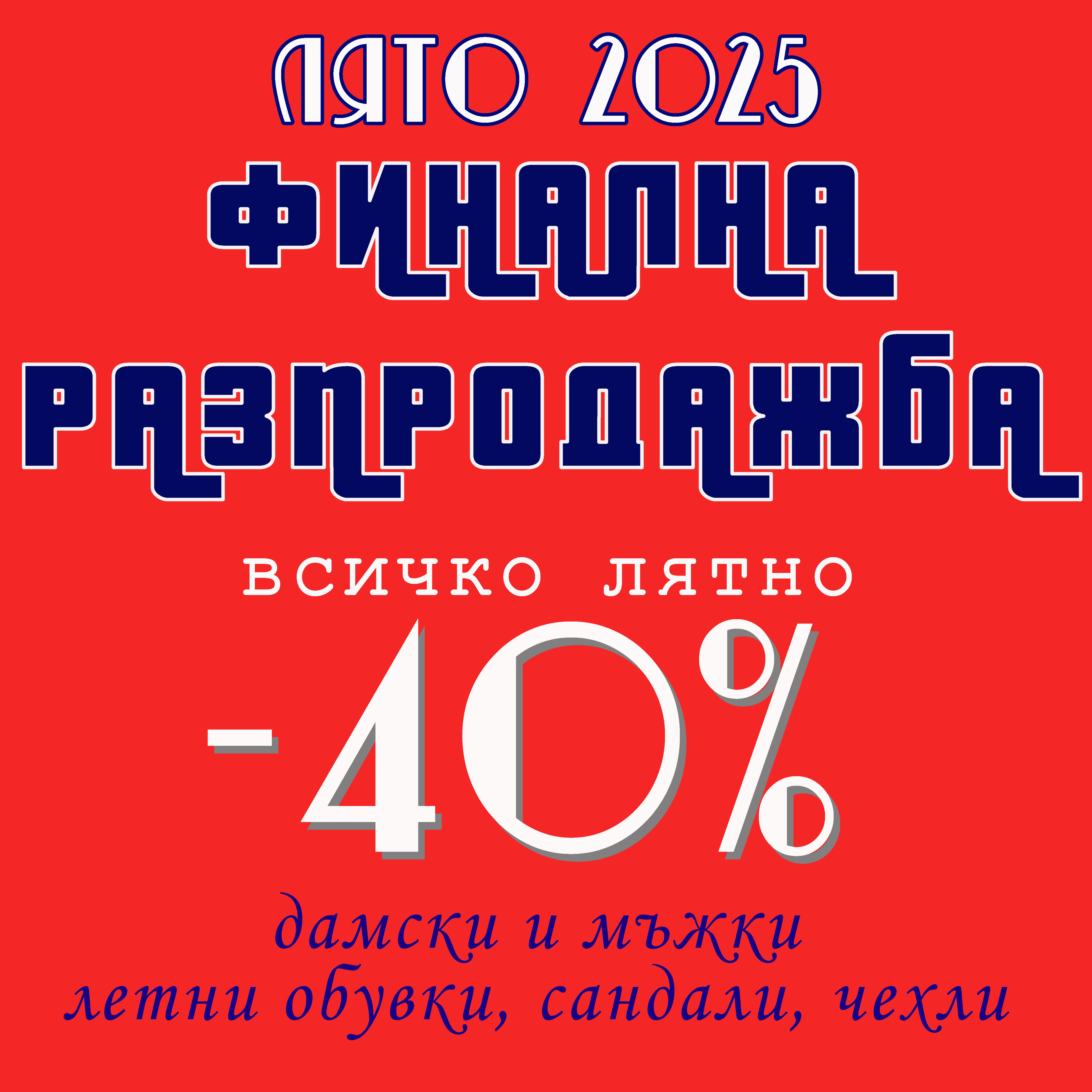 Последен шанс да се сдобиете с летни модели на неустоими цени! В тази категория ще откриете финално намаление на избрани летни обувки – мъжки и дамски, с отстъпки от -40%. Бройките са ограничени, а намалението важи до изчерпване на наличностите. Побързайте, защото това е вашата последна възможност да вземете любимите си обувки от лятната колекция 2025 на изключително добра цена!
