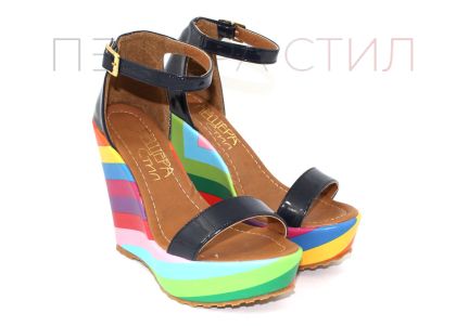 Дамски сандали на висока платформа изработени от изкуствен лак. Височина на платформата отпред 3.5 см, отзад 11 см. Цвят тъмно син.