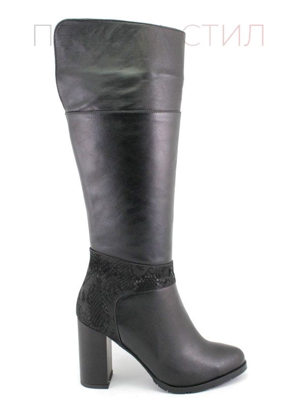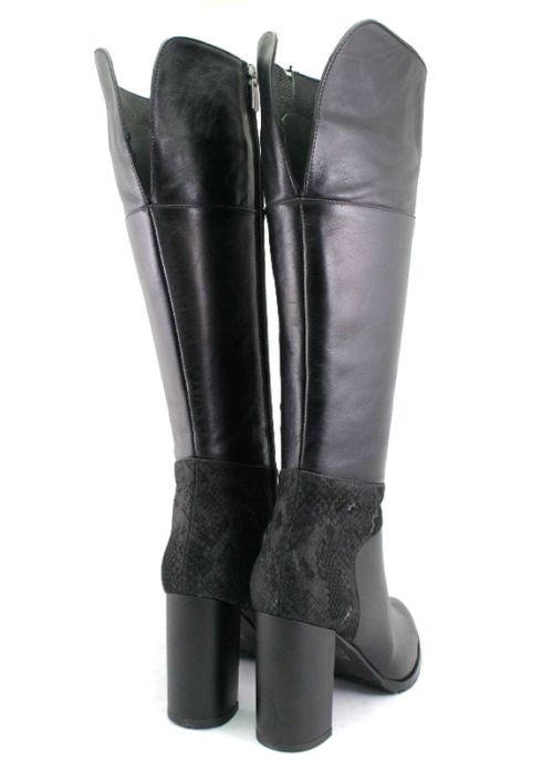 Дамски ботуши изработени от естествена кожа и детайл от естествена кожа със змийска шарка на висок ток. Цвят черен.