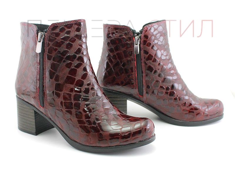 Дамски, елегантни боти изработени от естествена кожа с лачени елементи в ефектна кроко шарка на средно висок ток. Ботите са с два ципа, което спомага за бързо и лесно обуване.