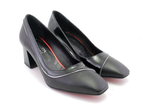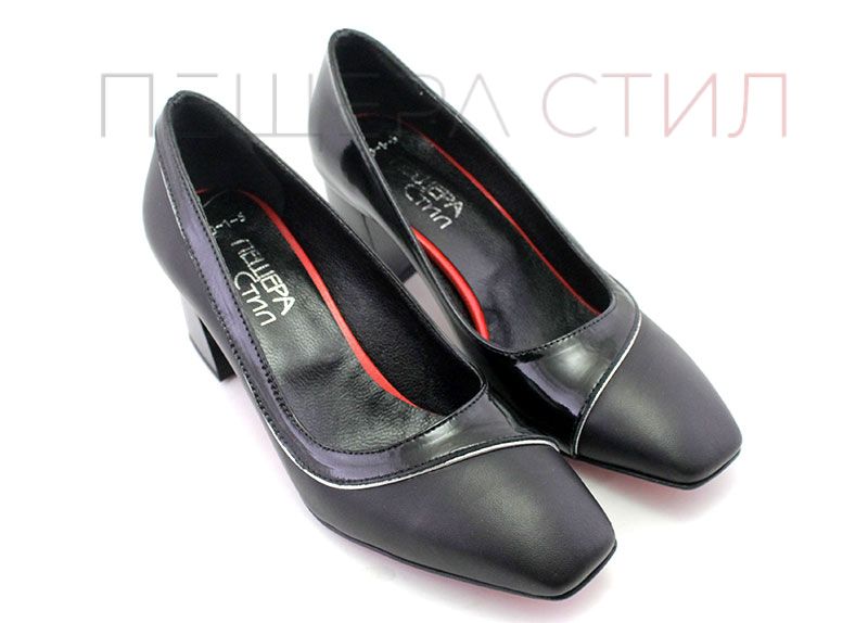 Дамски официални обувки изработени от естествена кожа в комбинация с естествен лак. Стелката и хастарът също са от естествена кожа. Обувките са изпробвани, добре стоят на крака, добре изглеждат и са удобни при носене с добре пасваща извивка на свода. Токът е широк и стабилен, много устойчив при ходене.