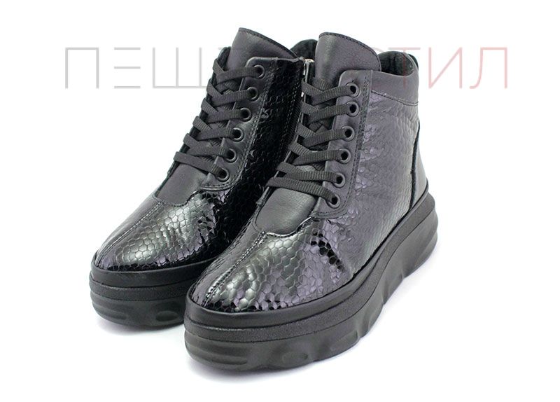 Дамски боти в спортен стил изработени от естествен лак със змийска шарка и естествена кожа на ниска платформа. Ботите са с цип, което спомага за бързо и лесно обуване. Красив модел, който стои много добре на крака, удобен и добре изглеждащ. Ботите са меки, без форт и бомбе.