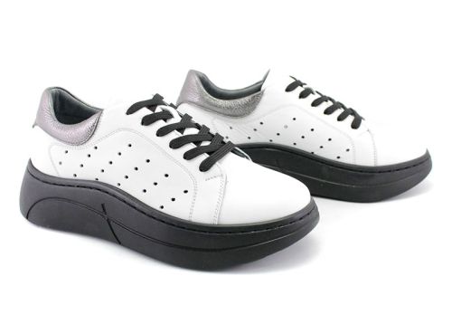 Дамски маратонки изработени от естествена, мека кожа в бял цвят с цялостна перфорация включително и хастара. Шито ходило.