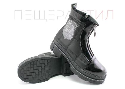 Дамски топли боти на ниско, шито ходило със зимен грайфер, изработени от изкуствен лак и непромокаем текстил.