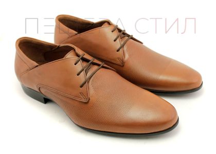Мъжки официални обувки изработени от светло кафява напа. Изчистен, класически дизайн, с фина лазерна перфорация подчертаваща елегантността на обувките. Моделът е с олекотено ходило, достатъчна ширина за пръстите. Хастар и стелка също са от естествена кожа.