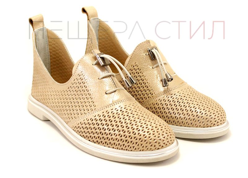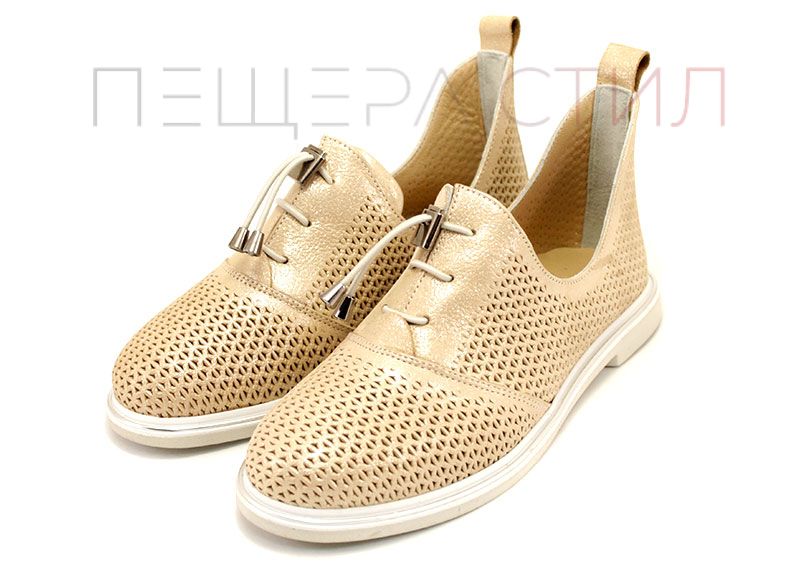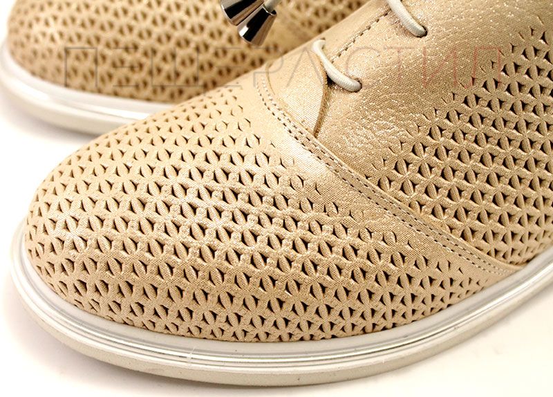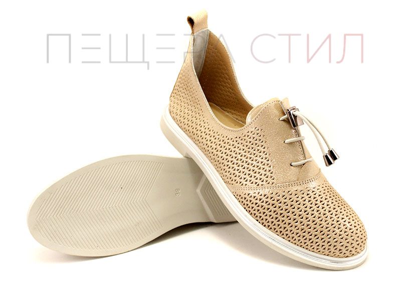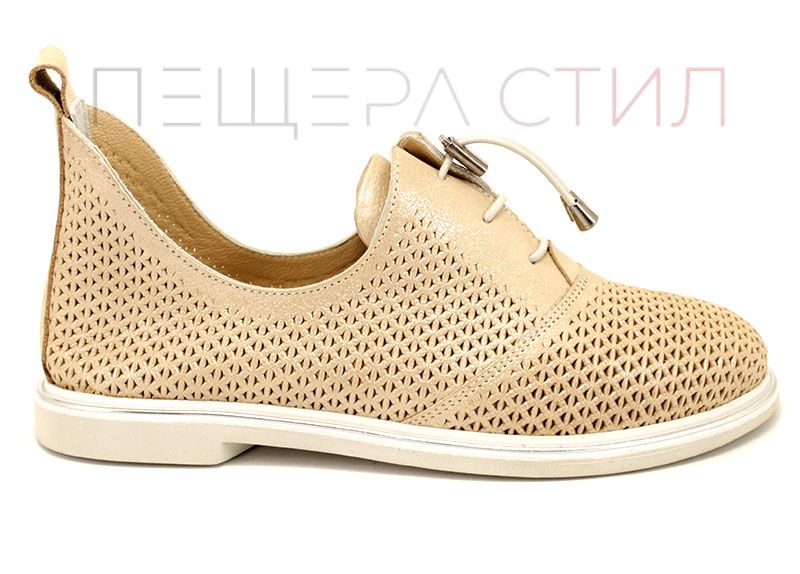 Дамски летни обувки изработени изцяло от естествена кожа със ситна перфорация. Цвят бежов сатен.