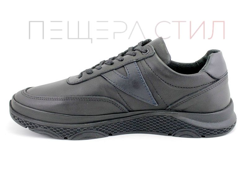 Мъжки спортни обувки изработени от мека, естествена кожа в черен цвят с акценти от тъмно синя кожа, на гъвкаво ходило със стелка също от естествена кожа.