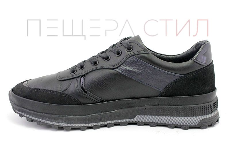Мъжки обувки спортен стил изработени от естествена, матова кожа в черен цвят в комбинация с елементи от черен лак, черен набук и сива кожа. Хастарът и стелката също са от естествена кожа.