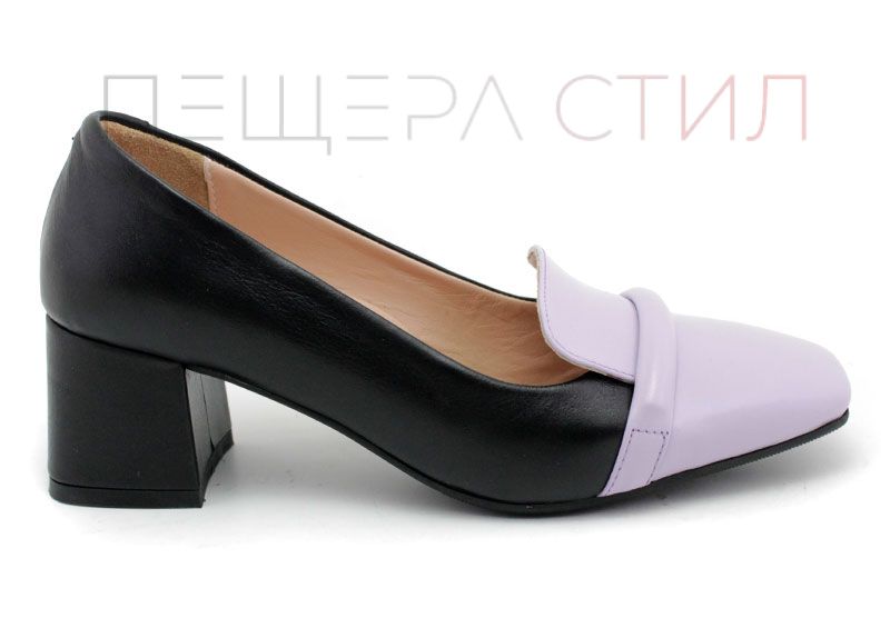 Дамски официални обувки в модерната цветова комбинация черно и лилаво, изработени от естествена кожа. Стелката и хастарът са от естествена кожа. Токът е широк и стабилен, много устойчив при ходене. Обувките са подходящи както за официални случаи така и за ежедневно носене.