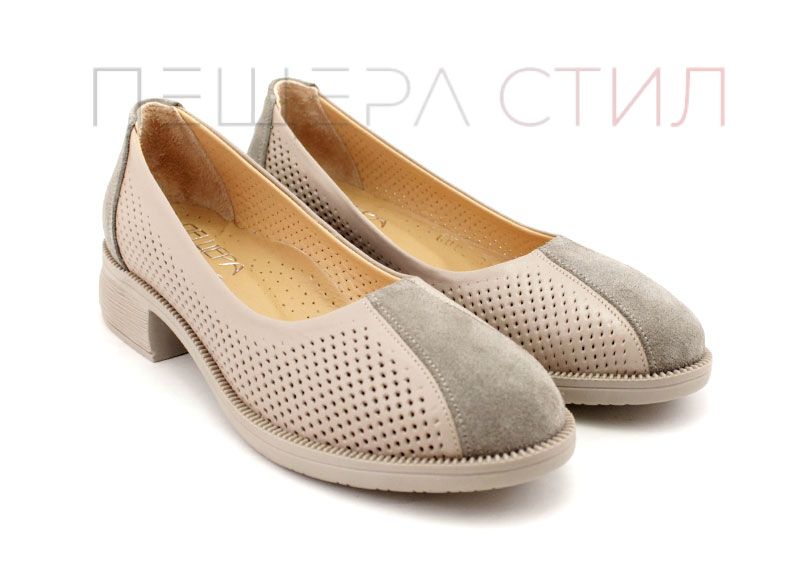 Дамски ежедневни обувки на гъвкаво, каучуково ходило с нисък ток, изработени от естествена кожа със ситна перфорация и елементи от естествен велур.  Стелката и хастарът също са от естествена кожа.