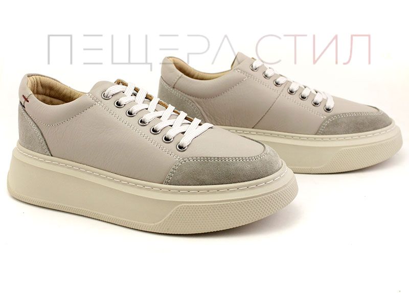 Дамски ежедневни обувки със спортна визия на ниска платформа, изработени от естествена кожа в модерния за сезона каменно сив цвят, в комбинация с естествен велур в сиво. Ходилото е шито. Стелката и хастарът също са от естествена кожа.
