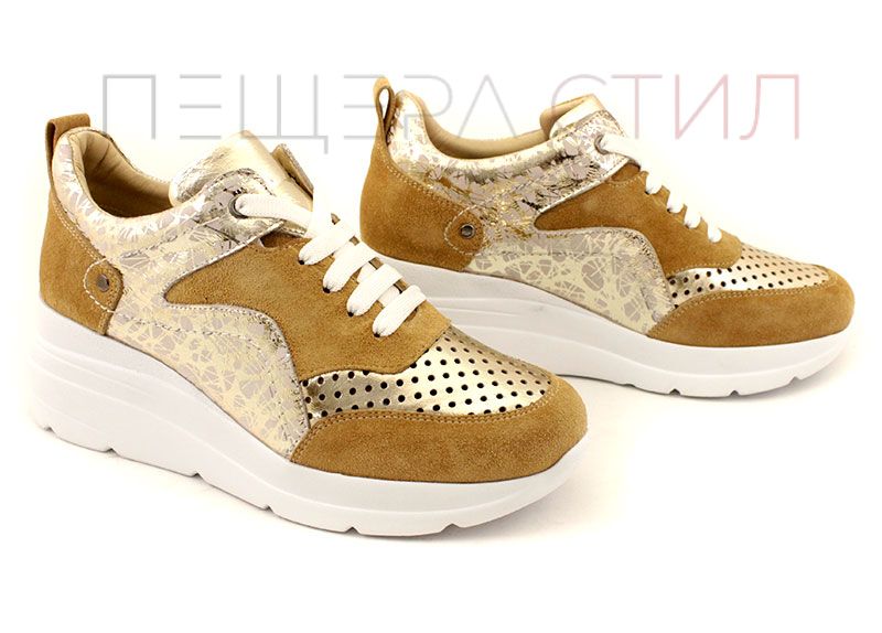 Дамските спортни обувки модел Ирма са с модерен и задигнат дизайн на ходилото, придаващ им стилна визия. Изработени са от златиста естествена кожа в комбинация с естествен велур в тютюнев цвят, което им придава изискан вид.