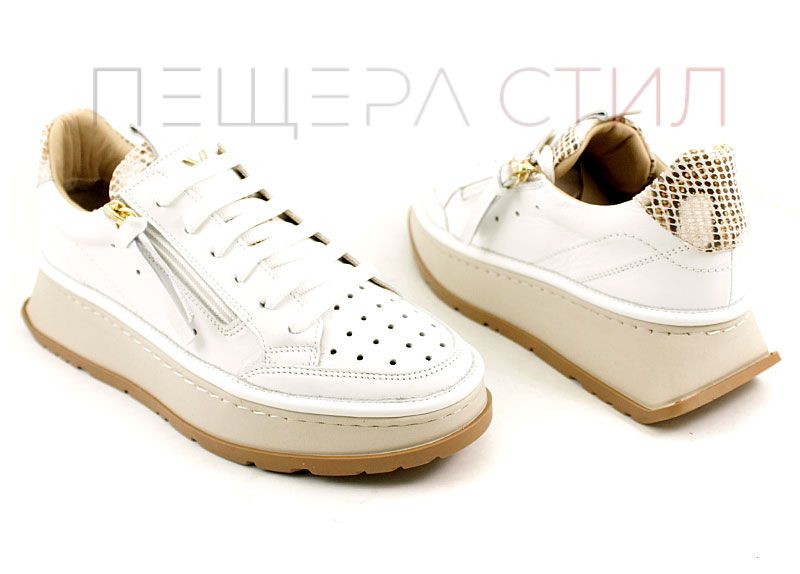 Дамските спортни обувки модел "Дилара" са с модерен дизайн и открояващи се детайли от кафява "змийска" кожа на фона на бяла кожа, което им придава изискан вид.