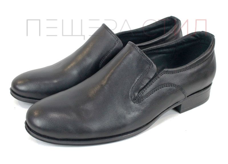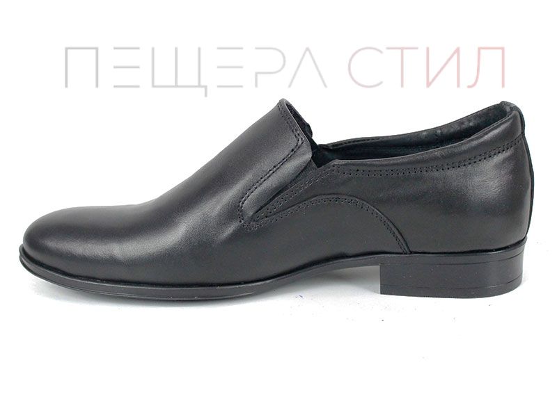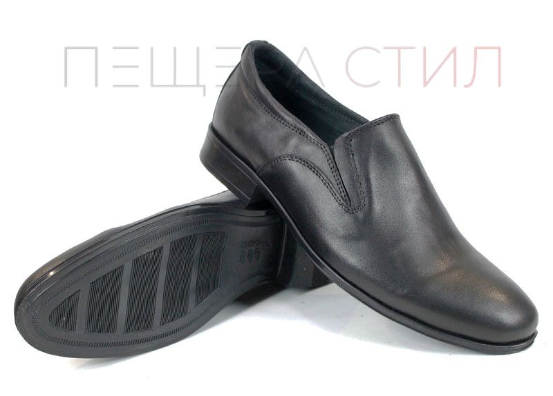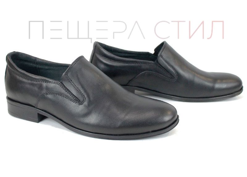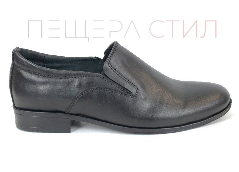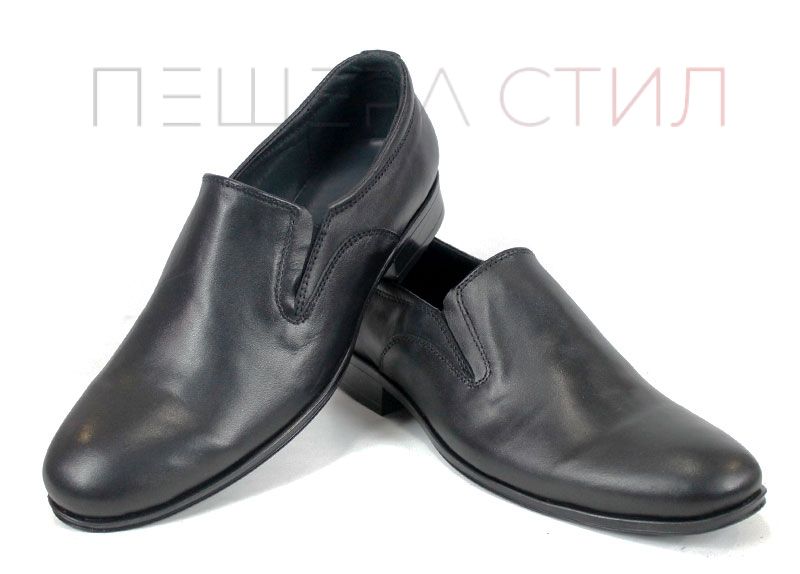 Мъжки официални обувки изработени от черна напа. Изчистен модел без връзки, с олекотено ходило, достатъчна ширина за пръстите и хастар и стелка от естествена кожа.