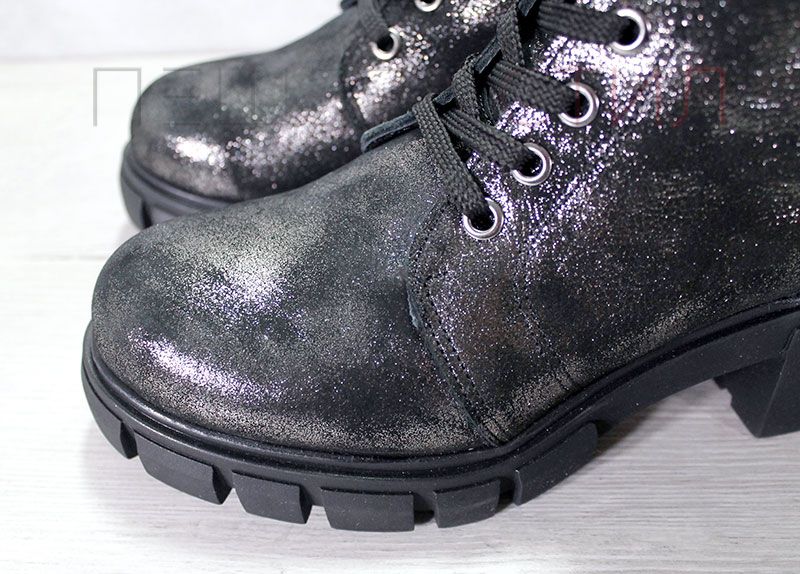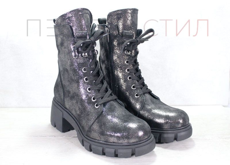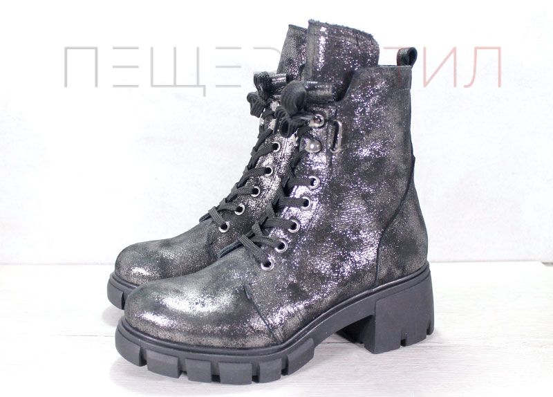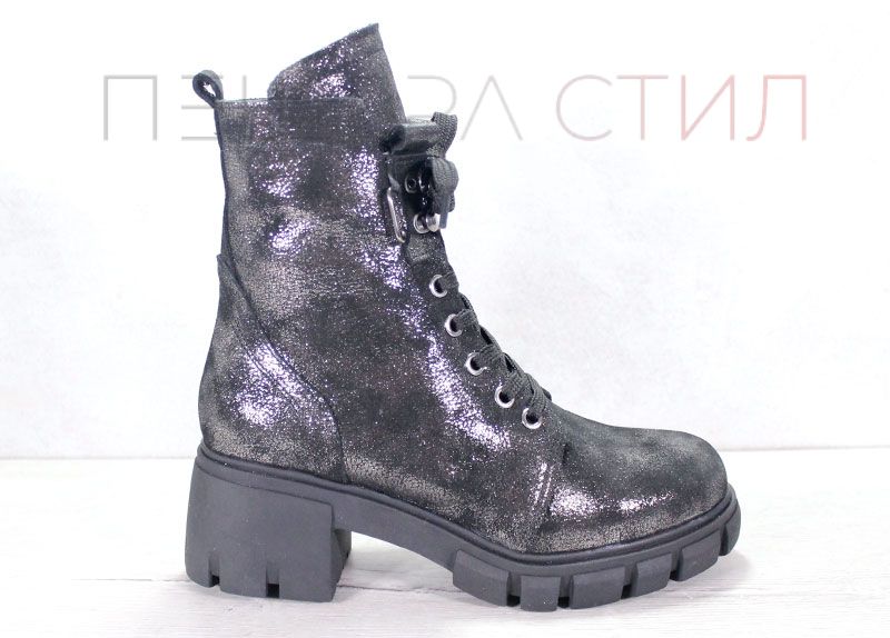 Елегантни дамски кубинки, изработени от естествена кожа с ефектен сребрист оттенък. Модел с висок език, връзки и цип за удобство, съчетан с дебело зимно ходило и топъл плюшен хастар, който осигурява комфорт и топлина през студените дни.