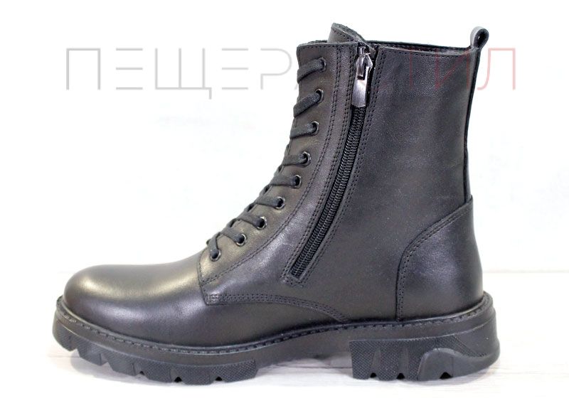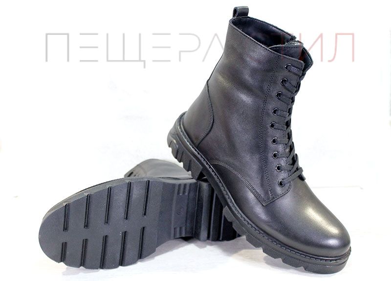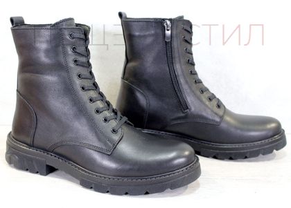 Мъжки боти изработени от естествена кожа на равно ходило с връзки и цип. Цвят черен.