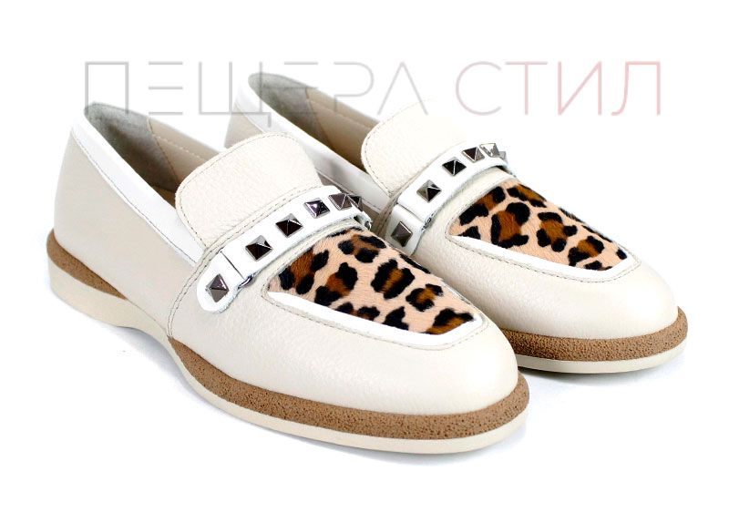Дамски ниски обувки от бежова и бяла естествена кожа с леопардова платка от кожа с къс косъм. Декоративна каишка с капси, олекотено ходило и стелка с мемори пяна.