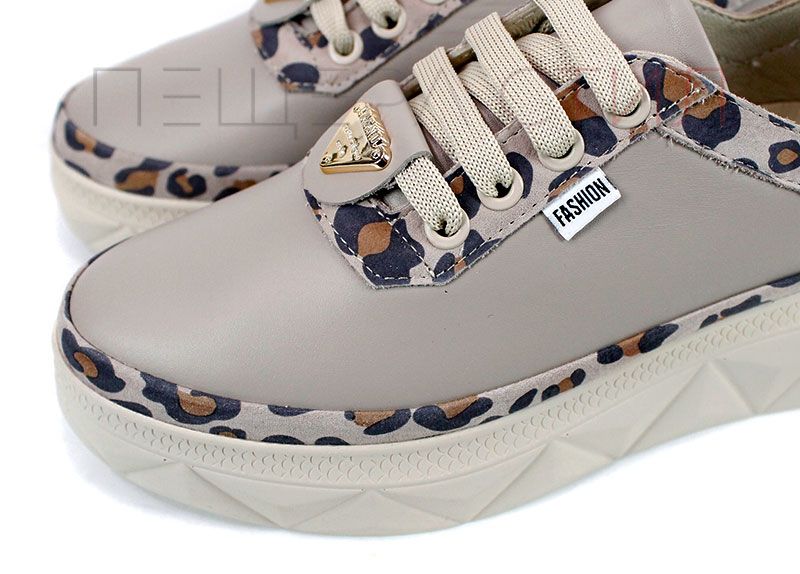 Дамски спортни обувки от естествена кожа в цвят визон и кантове с леопардов принт – модел Urban Motion