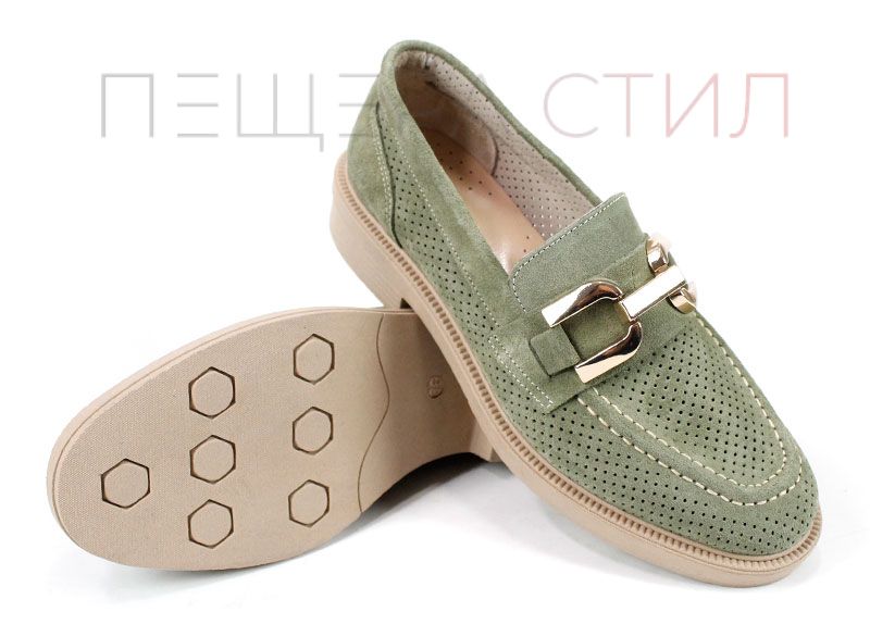 Дамски мокасини от естествен велур със ситна перфорация в светло зелено – модел Timeless Grace