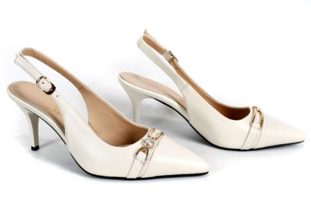 Дизайнът с отворена пета и тънка регулируема каишка осигурява стабилност и удобство, докато средно високият тънък ток придава изисканост и елегантност. Красивата златиста брошка, обсипана с фини камъчета, добавя луксозен завършек към модела, правейки го перфектен за официални събития, сватби, коктейли или стилни вечери.
