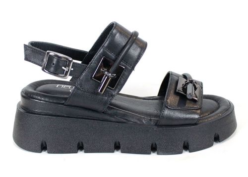 Семпъл модел сандали Bella Notte от черна естествена кожа с ефектни метални елементи. Стил и комфорт с удобна платформа и мека стелка.