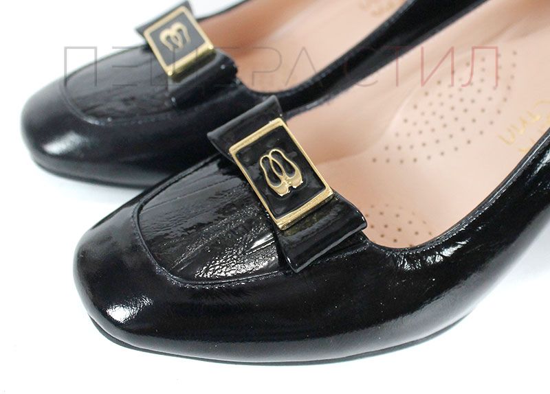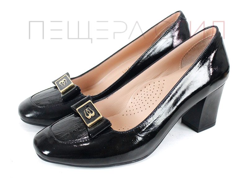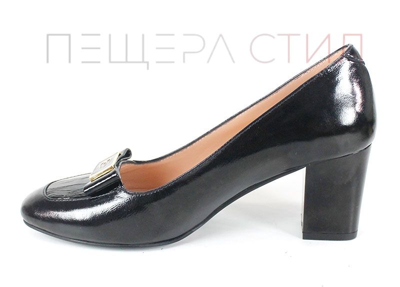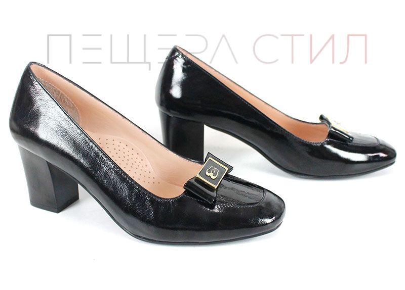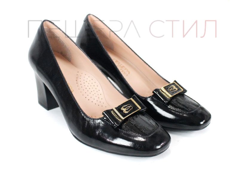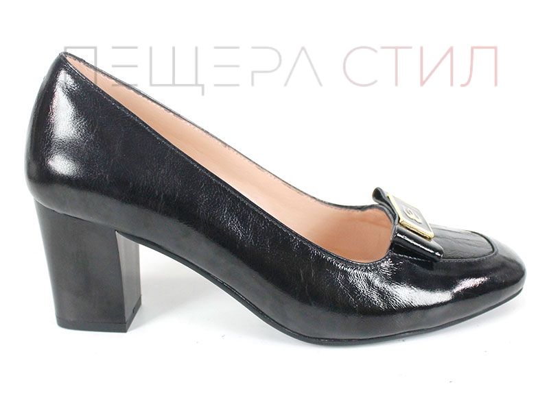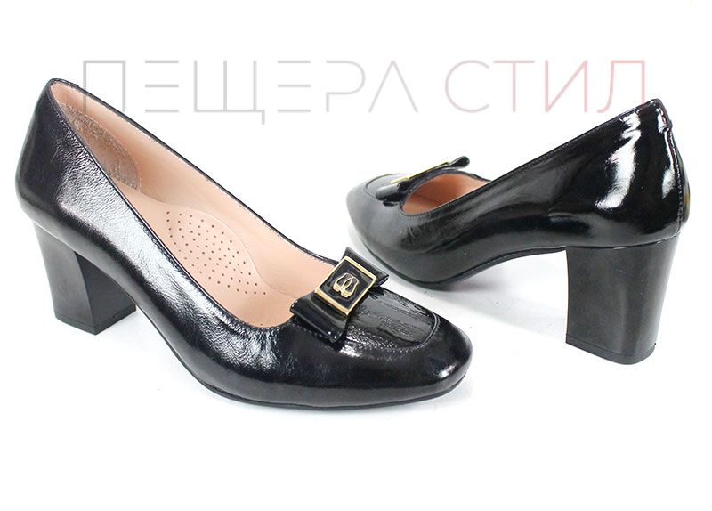 Classica са дамски елегантни обувки от естествен лак в черен цвят. Моделът е със стабилен ток, стелка и хастар от естествена кожа, украсен с луксозен декоративен елемент в златисто.