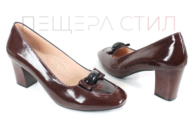 Rubino са дамски елегантни обувки от естествен лак в бордо цвят. Моделът е със стабилен ток, кожен хастар и стелка от естествена кожа, украсен с изискан декоративен елемент.