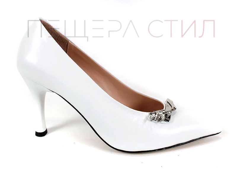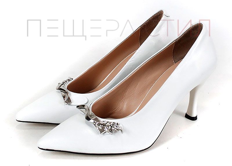 Елегантни дамски обувки от естествена кожа в бяло, с луксозна брошка, висок ток и комфортна стелка от естествена кожа. Перфектният избор за официални събития и специални моменти.