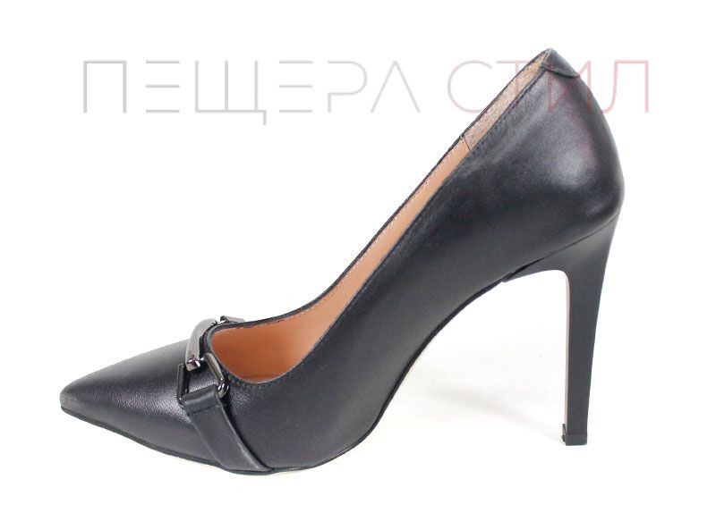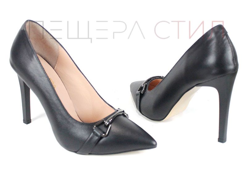 Острият връх и високият ток придават изисканост и увереност на всяка дама. Вътрешната част е с хастар и стелка от естествена кожа, осигуряващи комфорт дори при продължително носене. Металният декоративен елемент на предната част добавя завършеност и изтънчен акцент към цялостната визия.