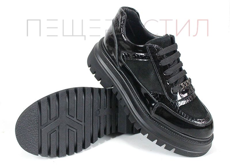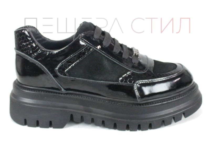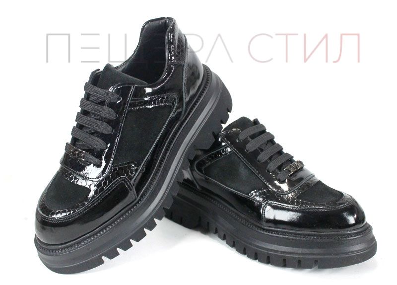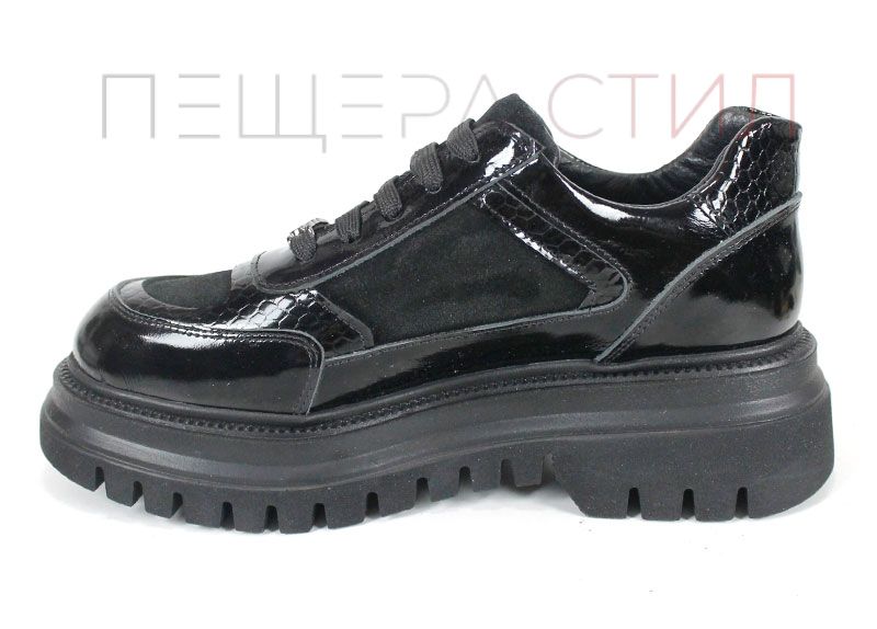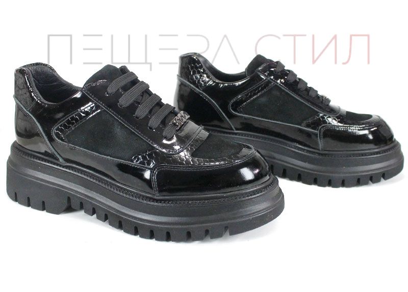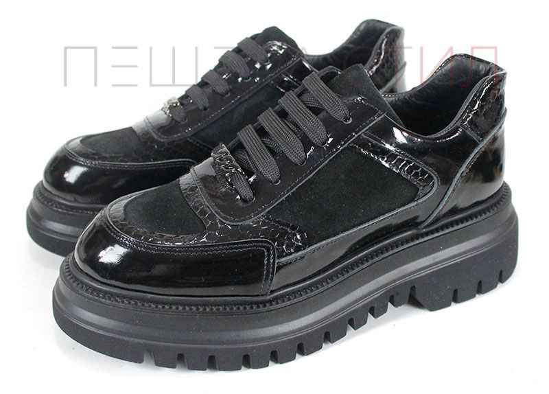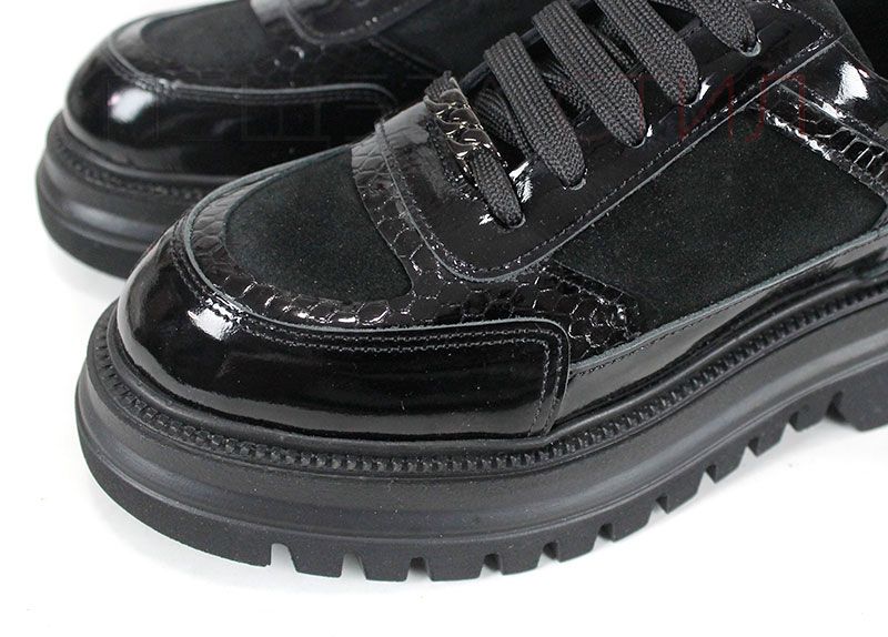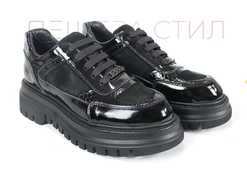 Моделът Nero Serpente е дръзка и стилна комбинация от черен лак, естествен велур и акценти с ефектен змийски принт. Обувките са върху равно дебело ходило и с вътрешност от естествена кожа за максимален комфорт.