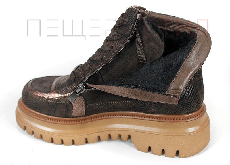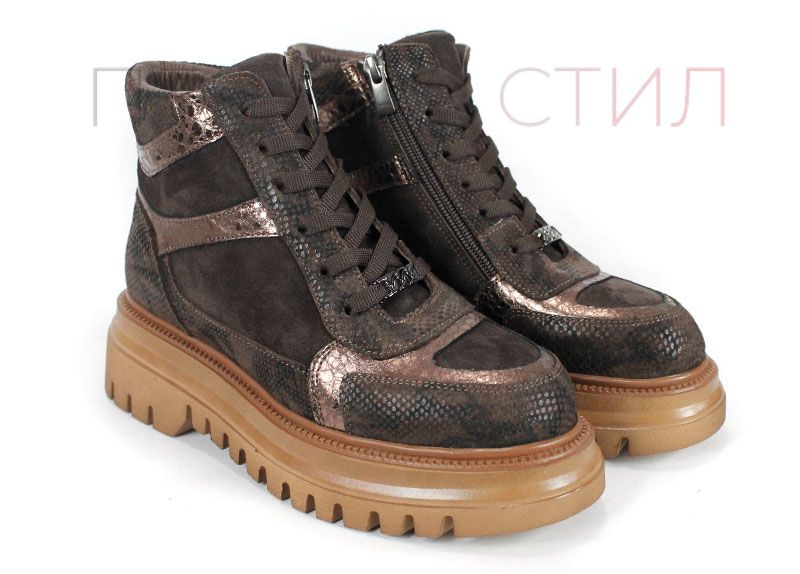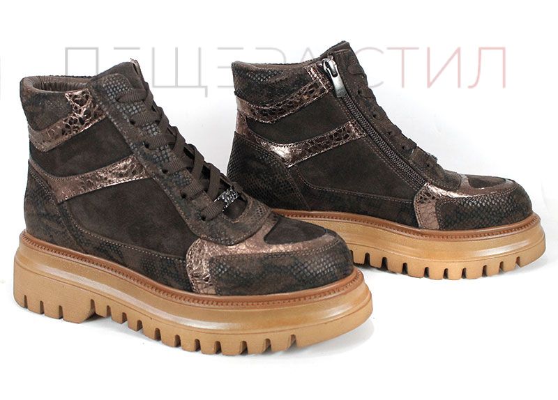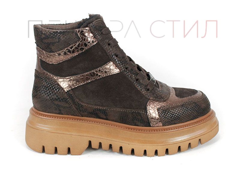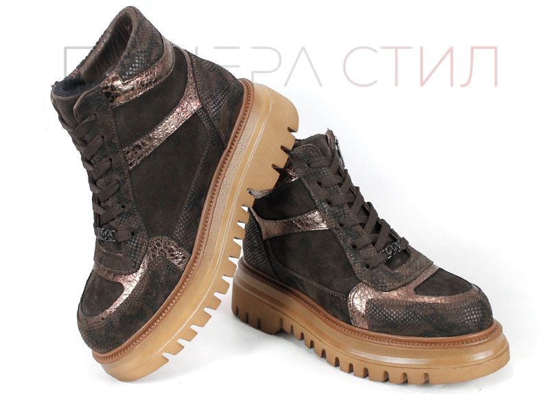 Дамски спортни боти, изработени от комбинация от естествен велур, кожа със змийски принт и блестяща кожа в меден нюанс. Моделът Bronza Forte впечатлява със своя характерен дизайн и високото си ходило, което осигурява стабилност и стилен силует. Хастарът и стелката от тънък топъл материал гарантират комфорт в хладните дни, а страничният цип улеснява обуването.