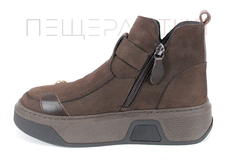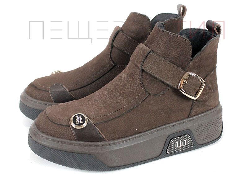Дамски модерни боти от естествен набук в тъмнокафяв цвят с изискан матов ефект. Декоративните кожени елементи и метална тока придават модерен характер, а шитото двуцветно ходило осигурява стабилност и комфорт при всяка стъпка. Подплатени с тънък топъл материал за допълнително удобство през студените дни.