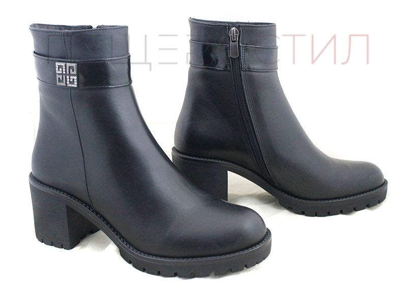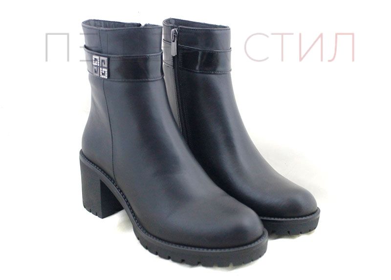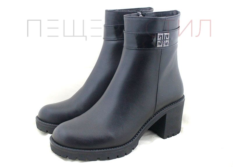 Елегантни дамски боти от естествена кожа с изчистен дизайн и фина метална украса в горната част. Стабилен средно висок ток, анатомично удобство и топъл хастар, подходящи за ежедневна или делова визия през студените дни.