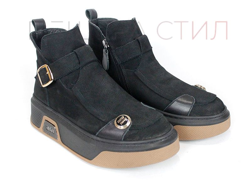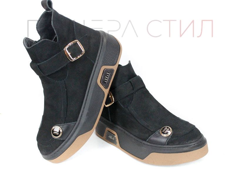 Дамски модерни боти от естествен набук в черен цвят, с декоративни кожени елементи и метална катарама. Подметката е ефектно решена в два тона, с шито покритие за здравина и стабилност. Хастарът е от тънък топъл материал, а стелката – от естествена кожа за максимален комфорт.