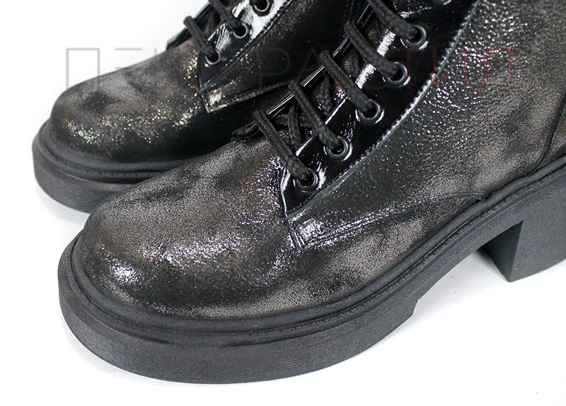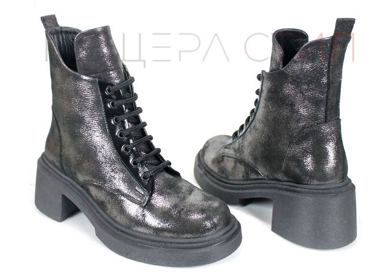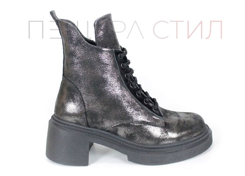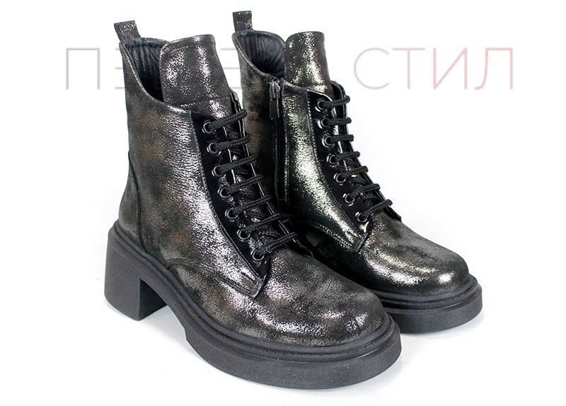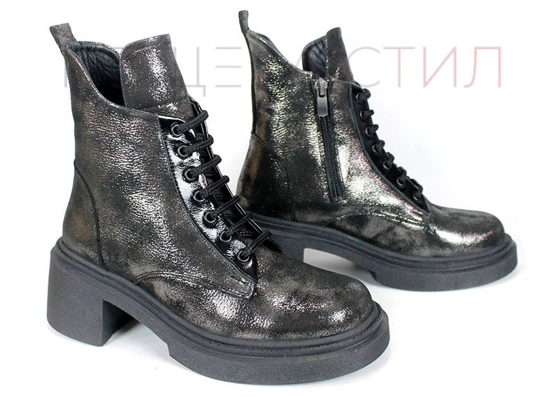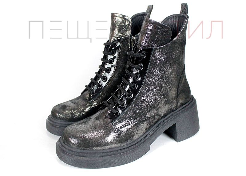 Ефектни дамски боти от естествена кожа с модерен металически принт в черно и сребристо. Моделът е с връзки и страничен цип за максимално удобство при обуване. Олекотено зимно ходило със средно висок дебел ток и топъл плюшен хастар за комфорт и топлина през студените дни.