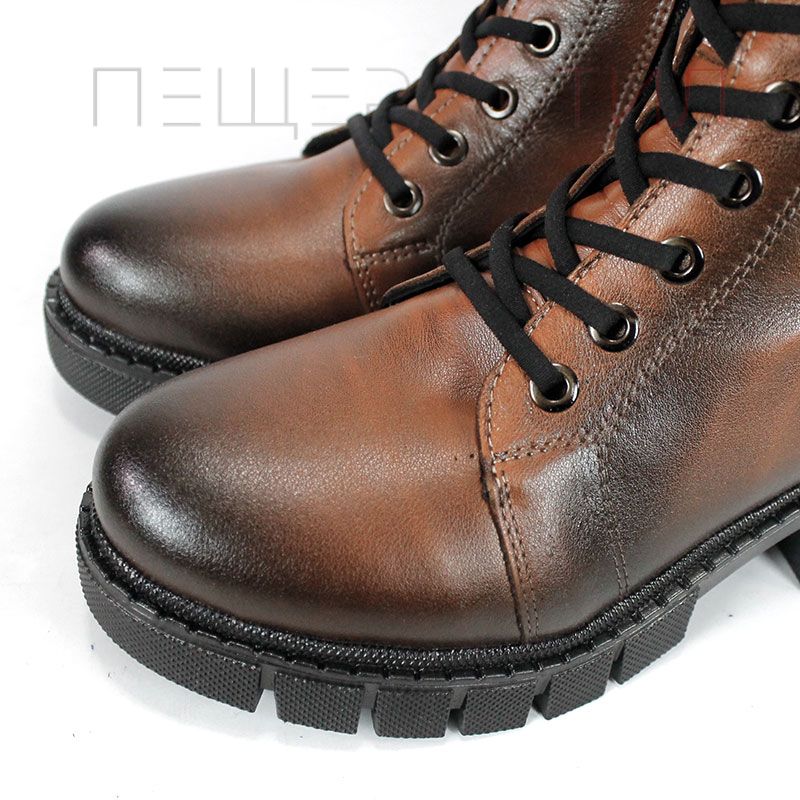 Елегантен модел Velluto Ombra, изработен от естествена кожа в светло кафяв цвят с ефект на състаряване. Комбинацията от връзки и страничен цип осигурява удобство, а топлият хастар тип мече прави модела подходящ за студените зимни дни.