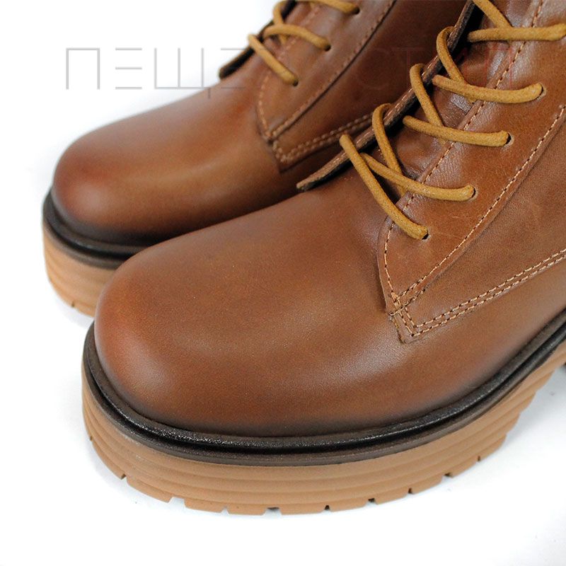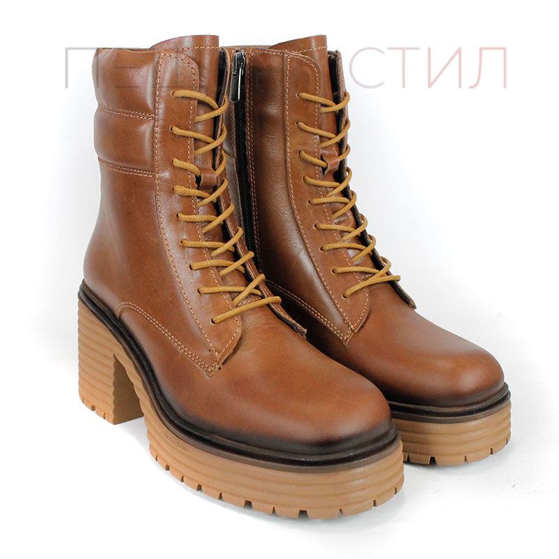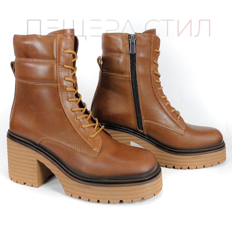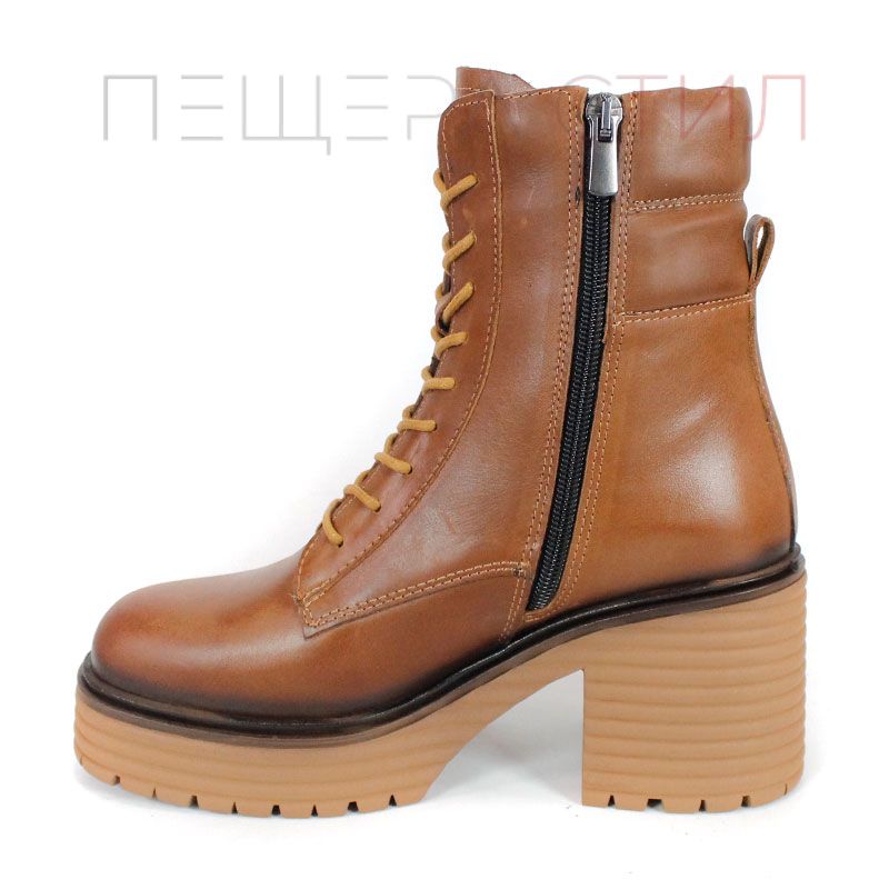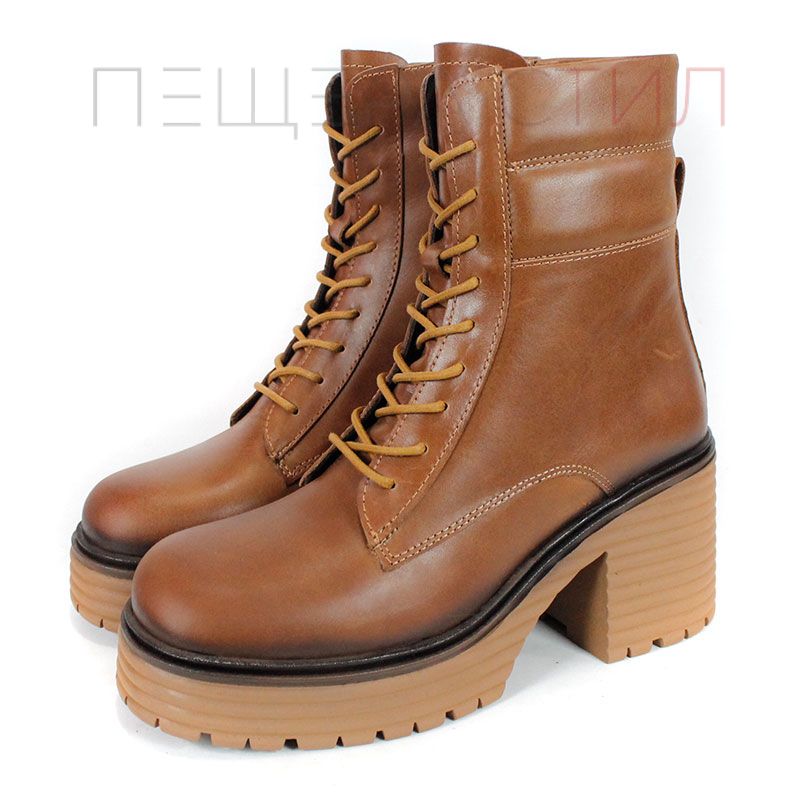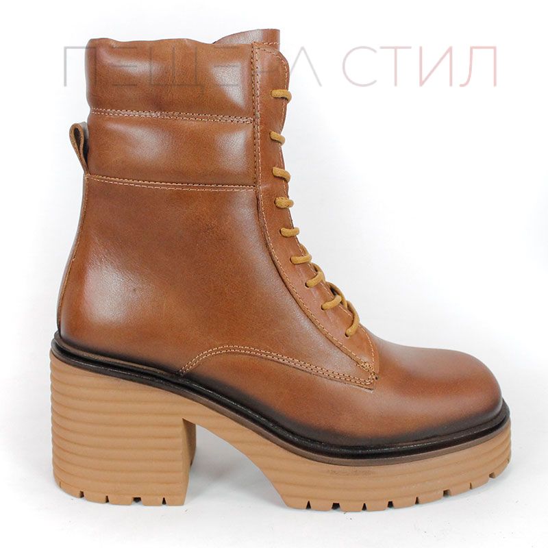 Модерни дамски кубинки от естествена кожа в светло кафяв цвят с връзки и страничен цип. Олекотено зимно ходило с ток и платформа осигурява стабилност и комфорт при ходене. Топъл плюшен хастар и стелка за уют и мекота през студените дни.