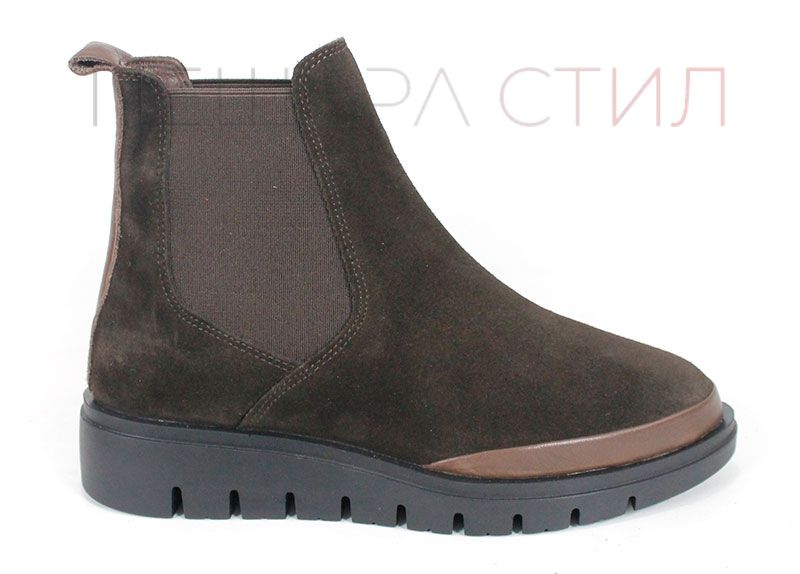 Елегантни дамски челси боти от естествен велур в тъмно кафяв цвят. Моделът Lumea съчетава стил, лекота и комфорт, с олекотено ниско ходило и еластични странични ленти за удобно обуване. Перфектен избор за есенни и зимни визии.