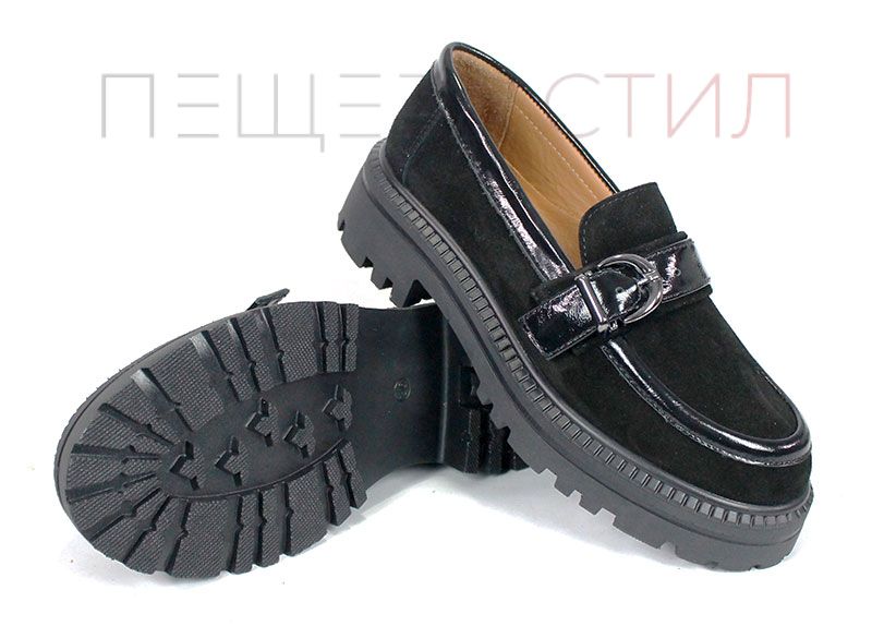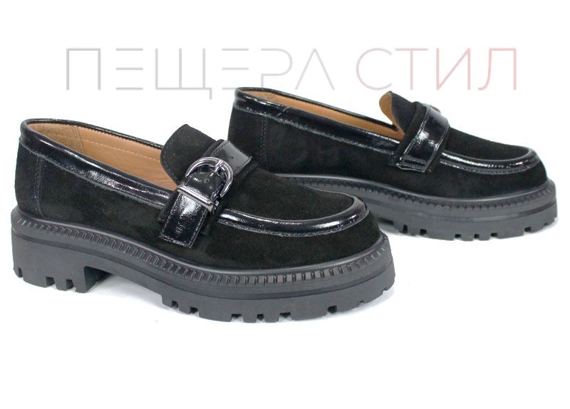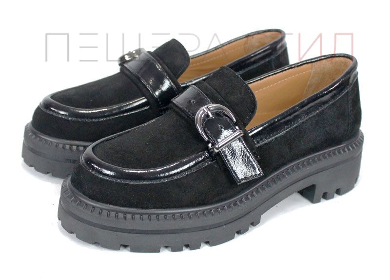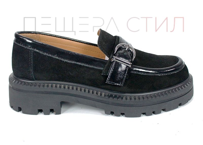 Модерни дамски лоуфъри от естествен велур в черен цвят, комбинирани с лачени елементи и декоративна метална тока. Моделът е с комфортно и стабилно дебело ходило, хастар и стелка от естествена кожа, осигуряващи удобство през целия ден.