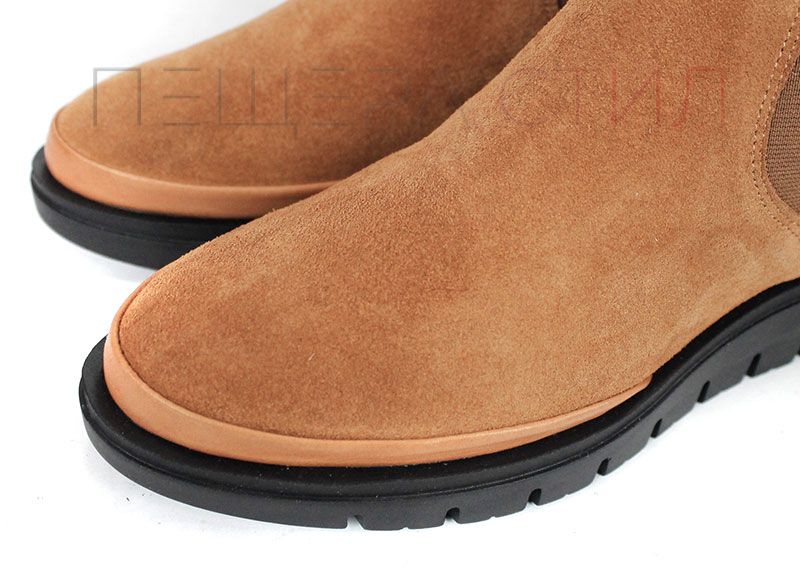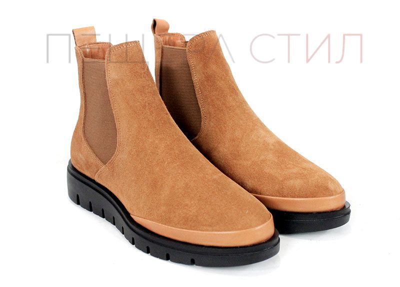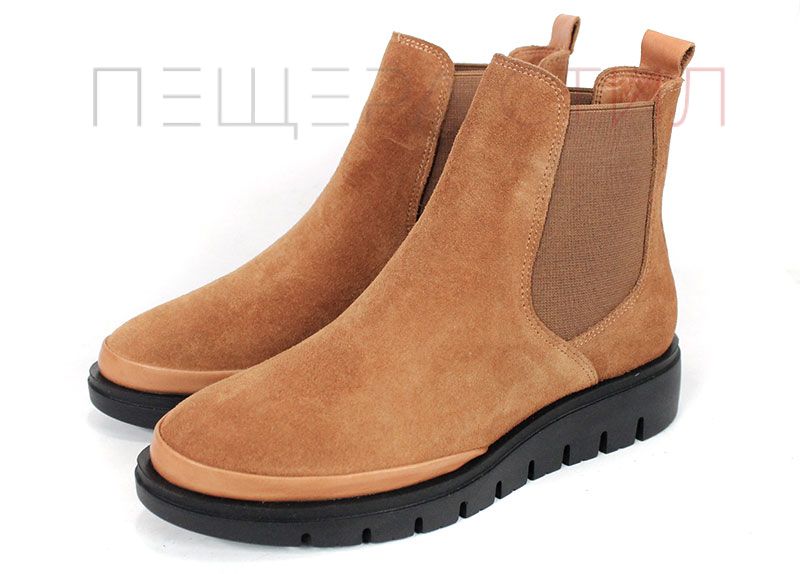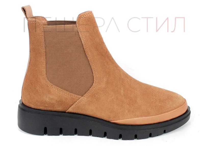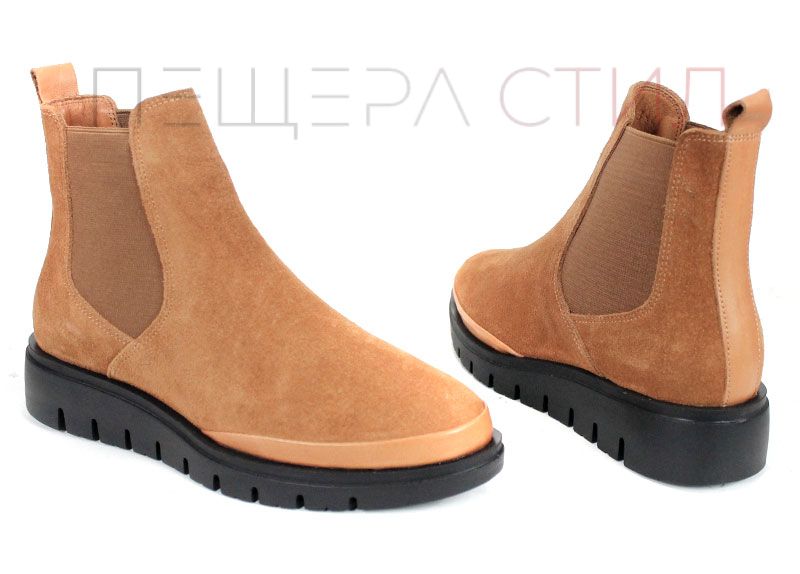 Елегантни дамски челси боти от естествен велур в топъл светло кафяв нюанс. Моделът разполага с удобни еластични странични ленти за лесно обуване и олекотено ходило за комфорт при ежедневна употреба.