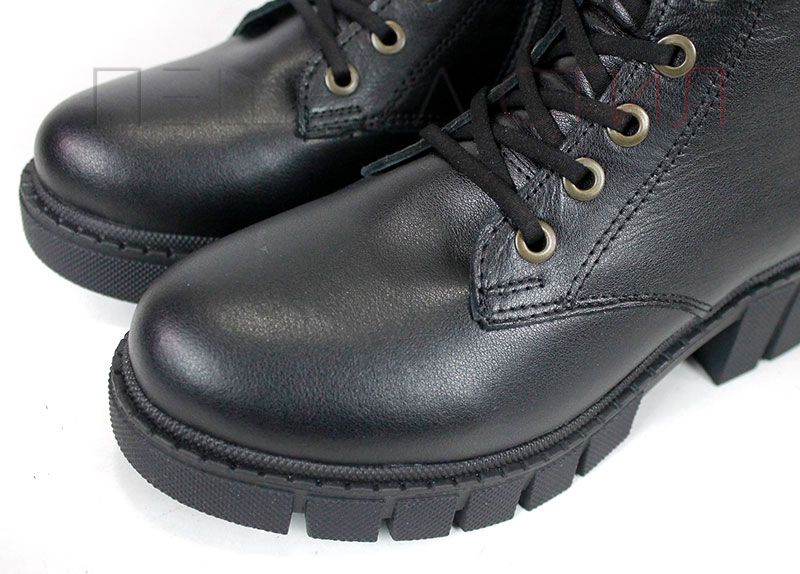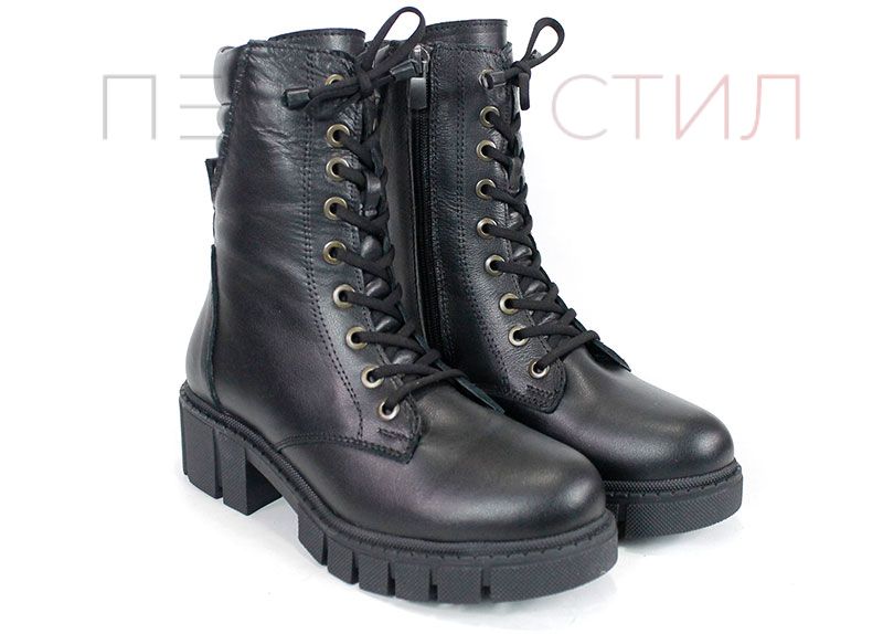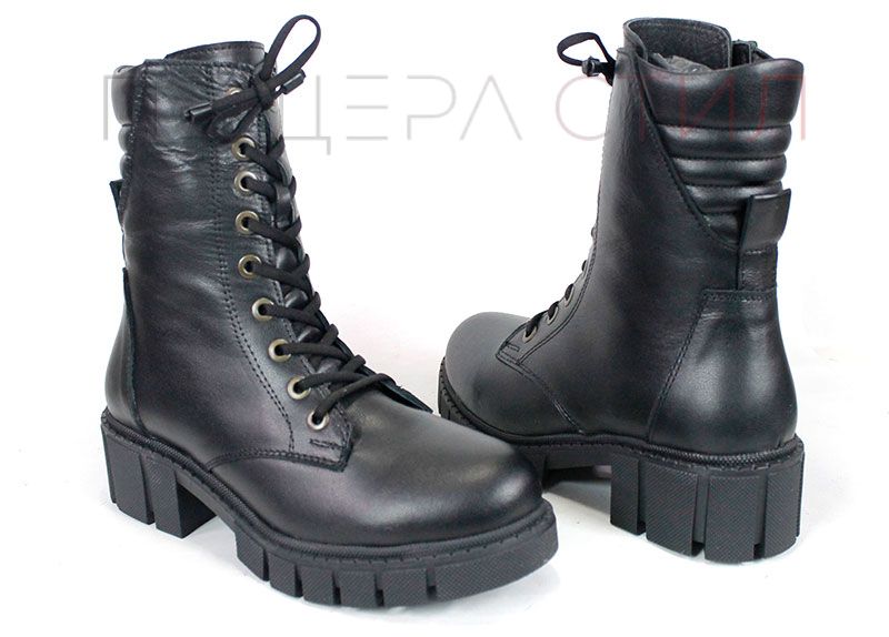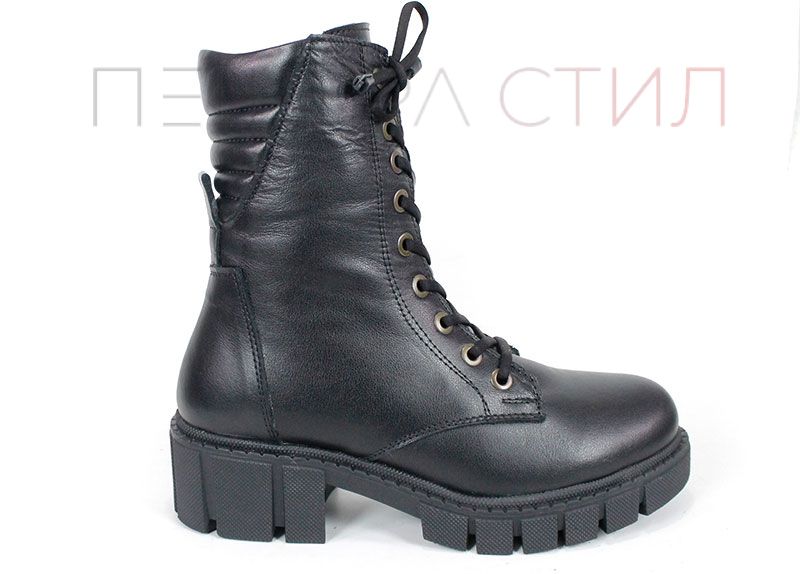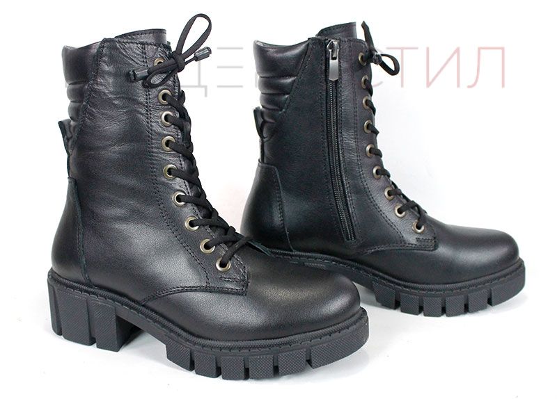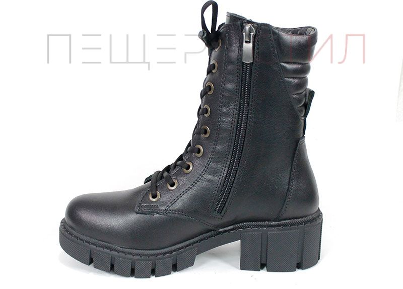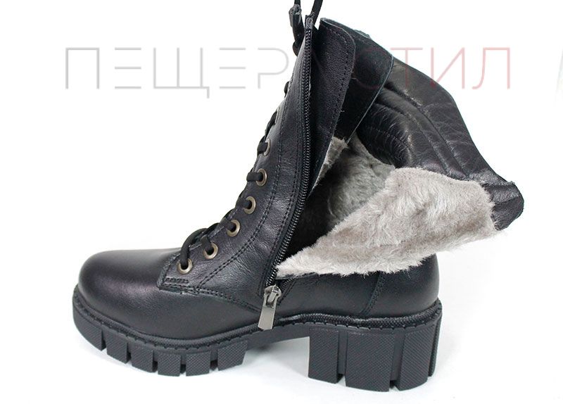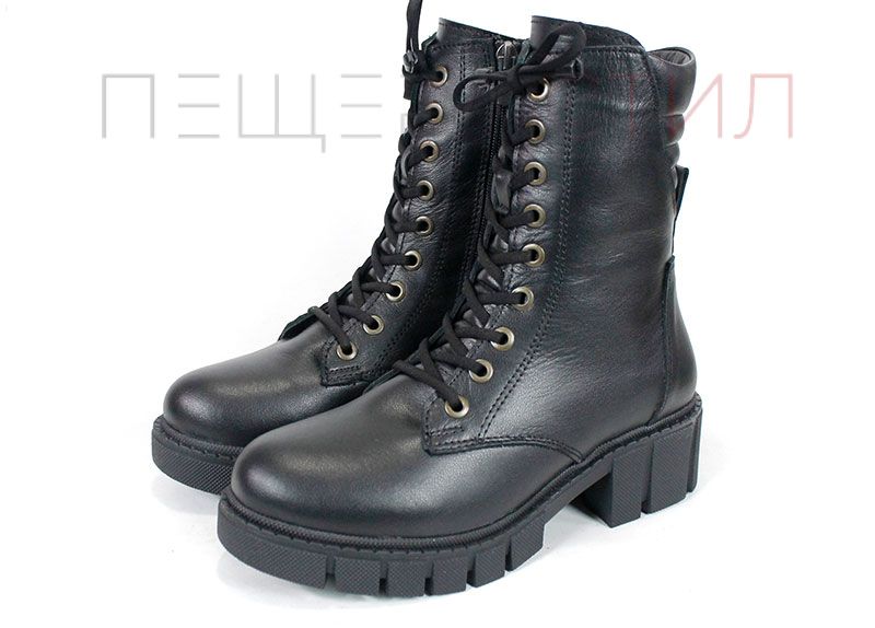 Класически черни дамски кубинки от естествена кожа с връзки и цип, стабилен ток и гъвкаво ходило. Топъл хастар тип мече осигурява комфорт и уют през студените дни.