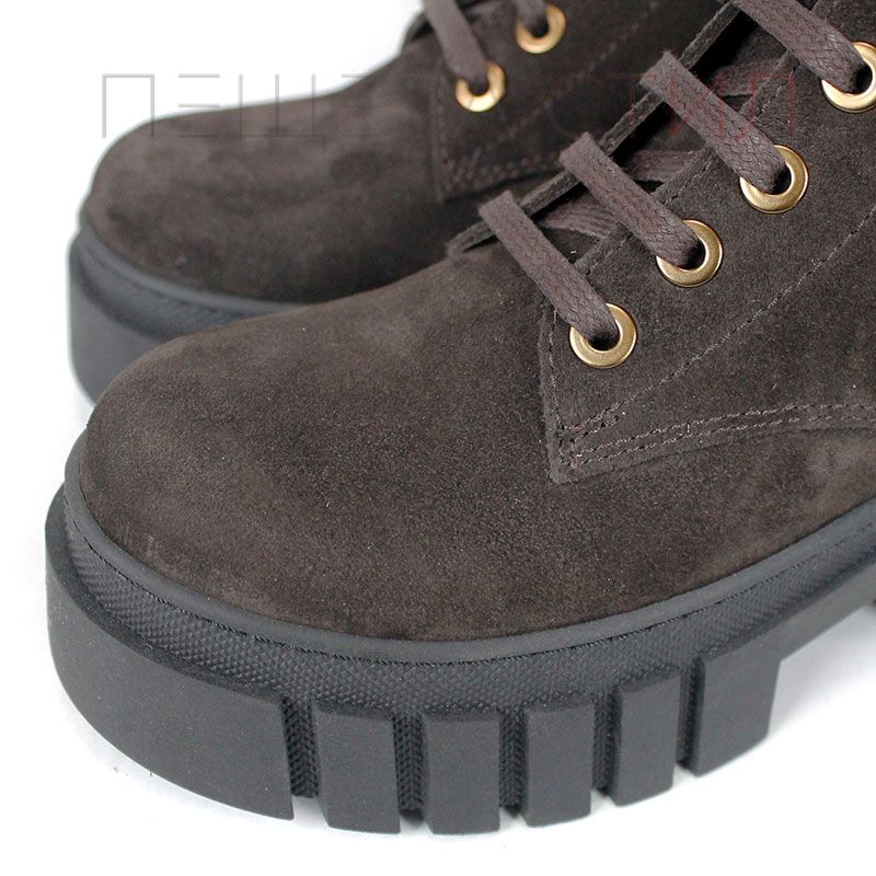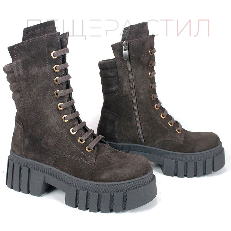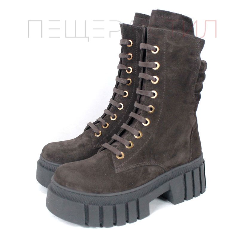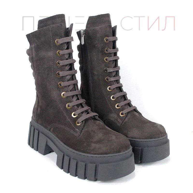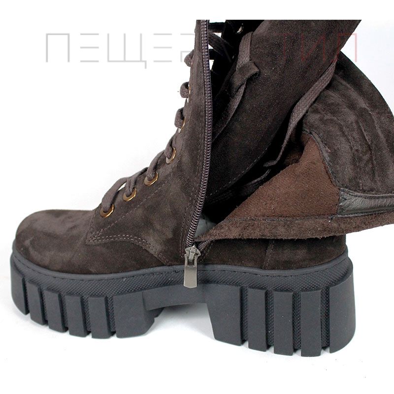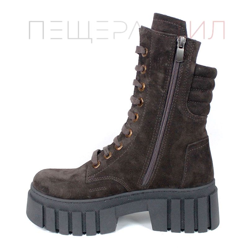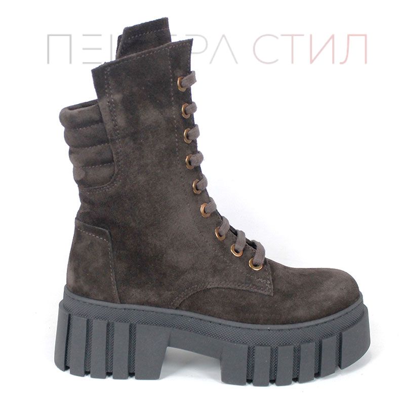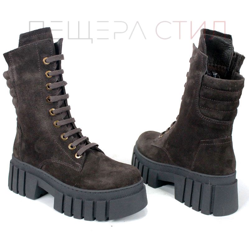 Стилни дамски кубинки от естествен велур в дълбок тъмно кафяв цвят. Масивна модерна платформа, връзки и цип за бързо обуване. Перфектни за дързък и модерен зимен стил.