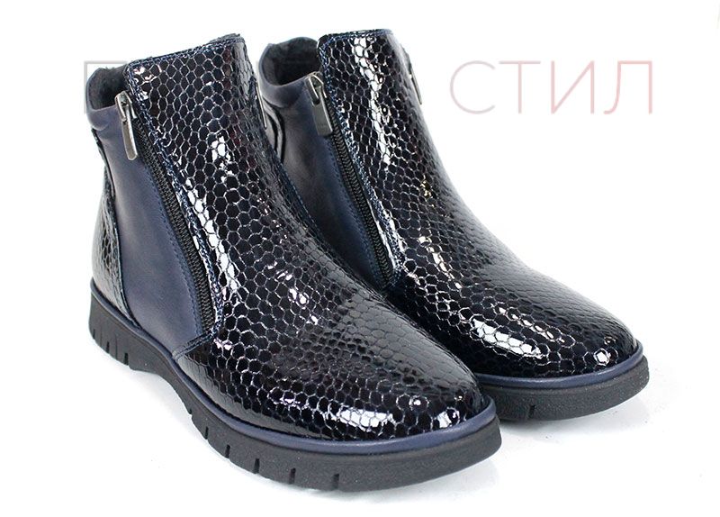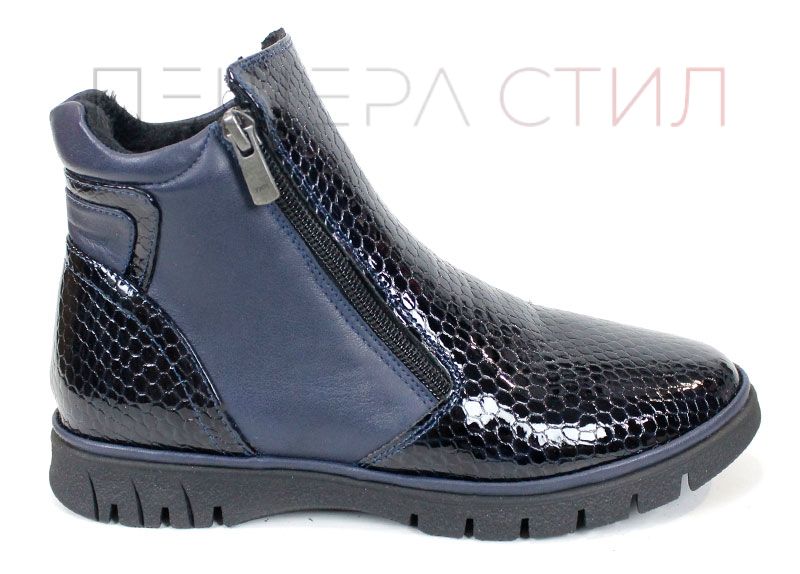 Дамските ниски боти Velina Forte в тъмносиньо са създадени за дами, които ценят елегантността и удобството в ежедневието си. Комбинацията от естествен лак с релефен ефект и гладка естествена кожа придава модерен и изискан вид.