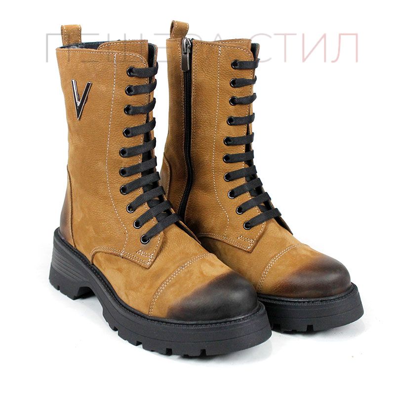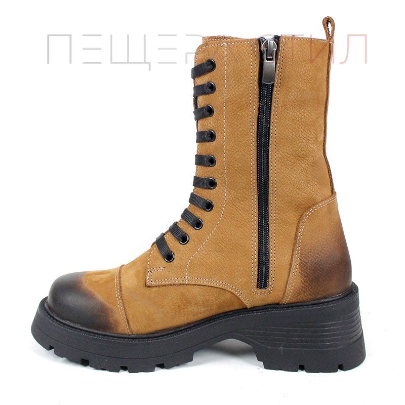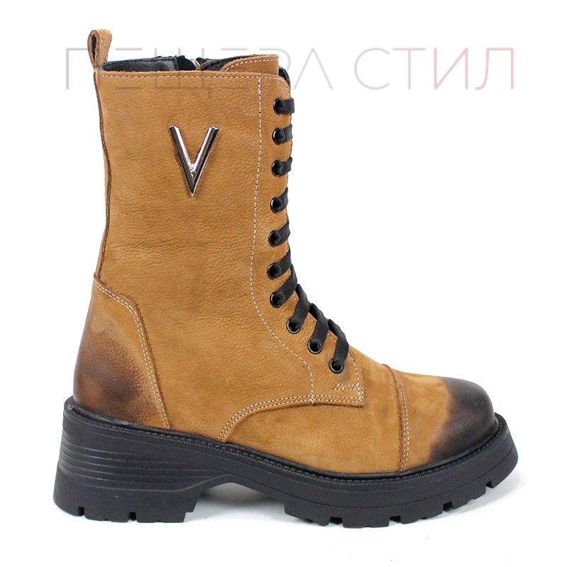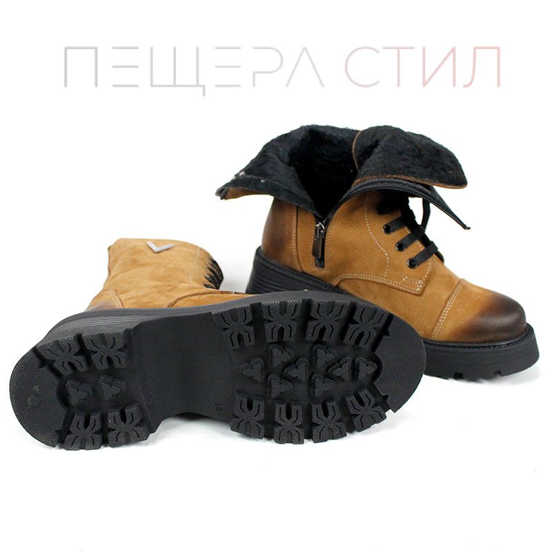 Дамски кубинки от естествен набук в цвят тютюн, с леко състарен ефект, зимно ходило за стабилност, топъл хастар и стелка за комфорт през студените дни.