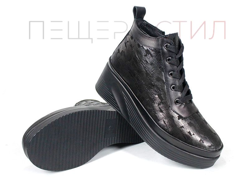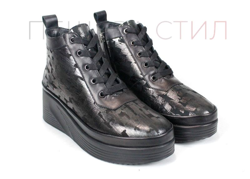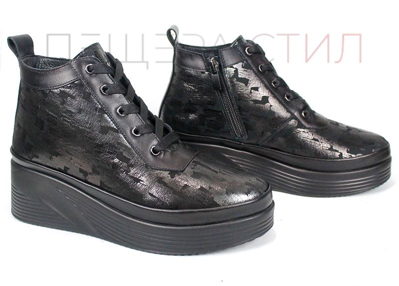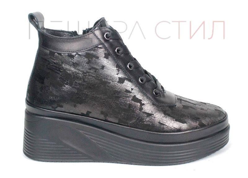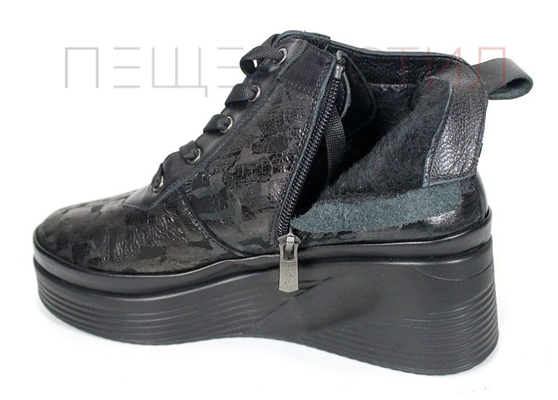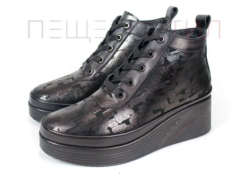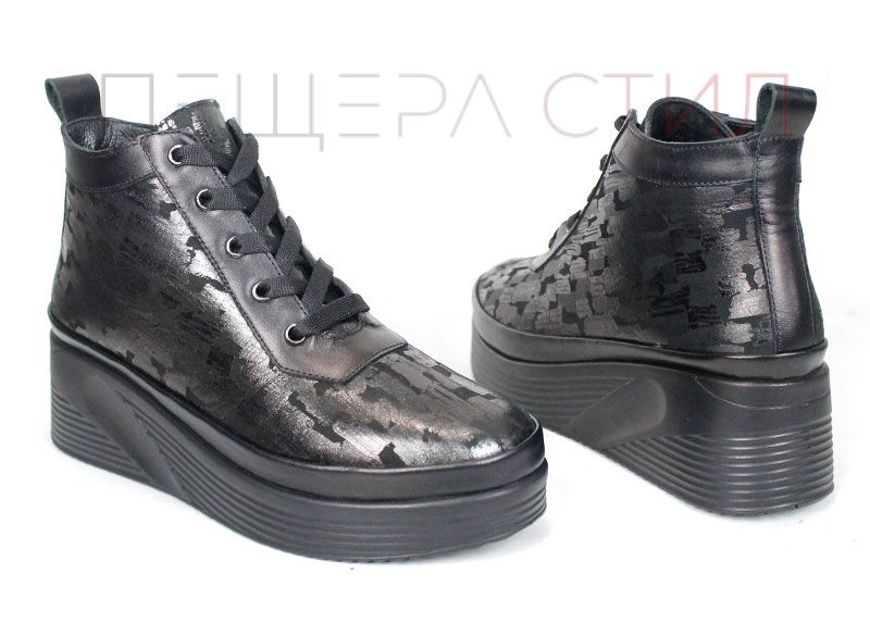 Дамските боти Perle Noire на Пещера Стил комбинират модерен стил, висококачествени материали и функционален дизайн. Изработени са от естествена кожа с елегантен металически ефект в цвят тъмна перла, който придава изтънчен и модерен вид. Моделът разполага с връзки за индивидуално регулиране и цип от вътрешната страна за по-удобно обуване. Вътрешната част е от мек плюшен хастар и топла стелка, осигуряващи изключителен комфорт и топлина в студените дни. Олекотената и стабилна подметка е създадена за удобство при продължително носене, а дизайнът с лека платформа придава модерен и изискан завършек.