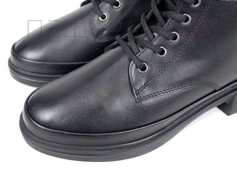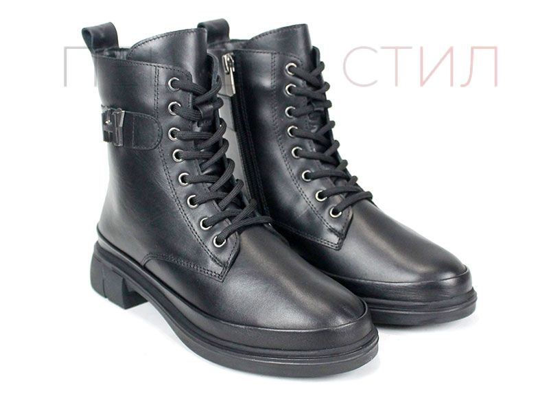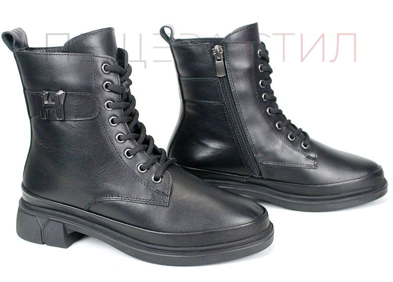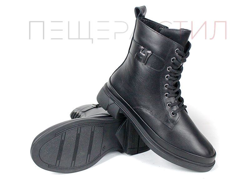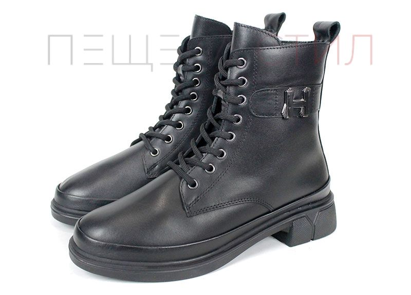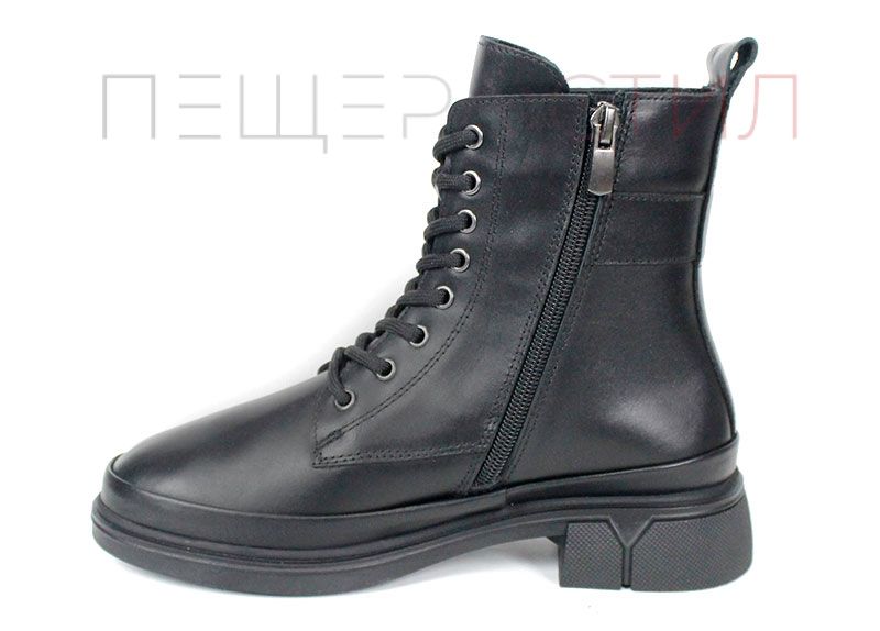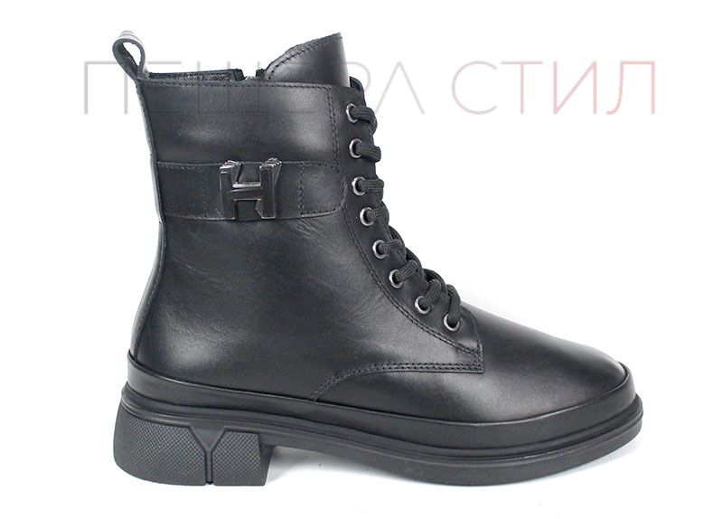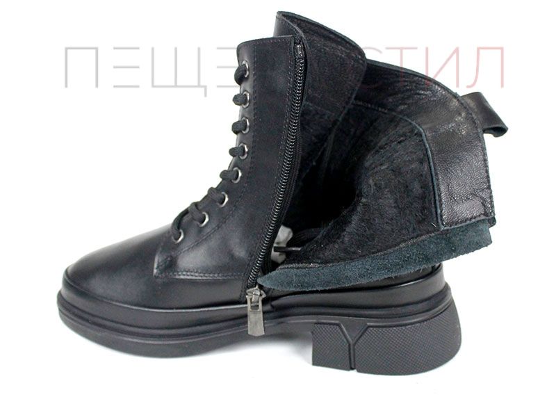 Дамски кубинки Noir Forte от естествена кожа в черно. Модерен минималистичен дизайн с връзки, страничен цип и нисък ток за стабилност и комфорт.