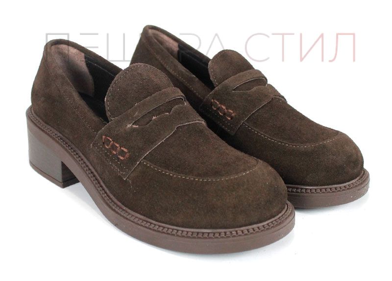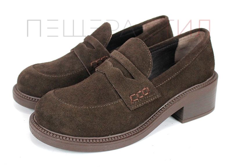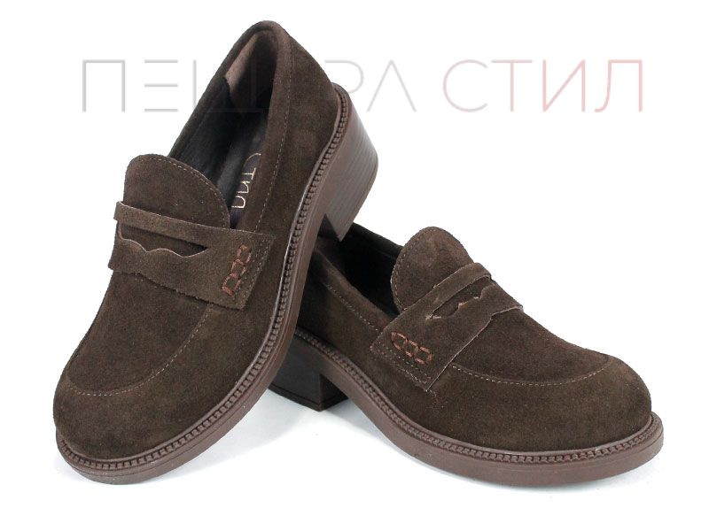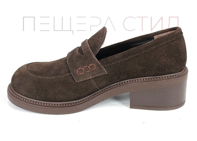 Изискани дамски лоуфъри от естествен велур в наситен тъмно кафяв цвят. Модел с елегантно оформено ходило, стабилен ток и мек вътрешен комфорт от естествена кожа. Отличен избор за стилна визия през целия ден.