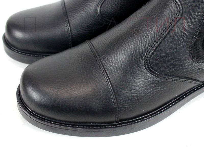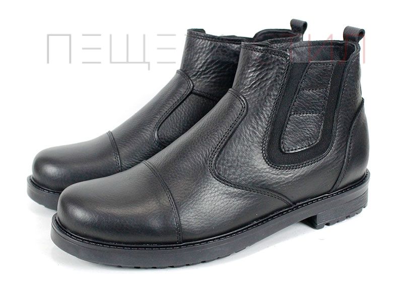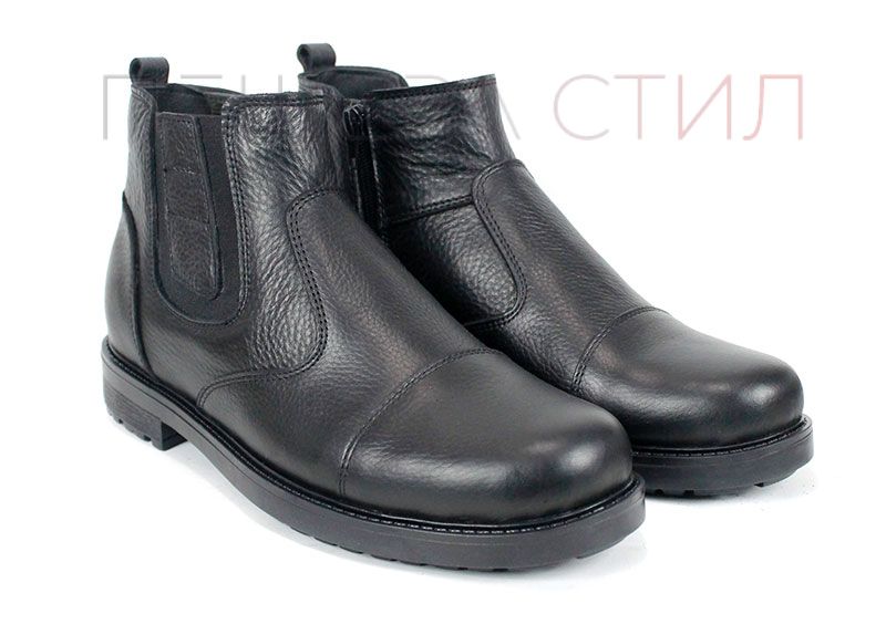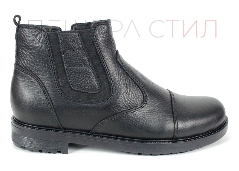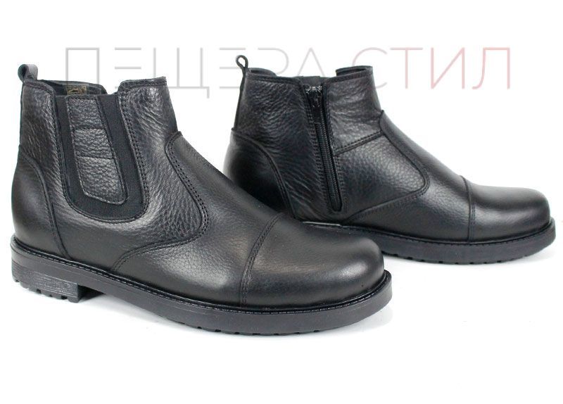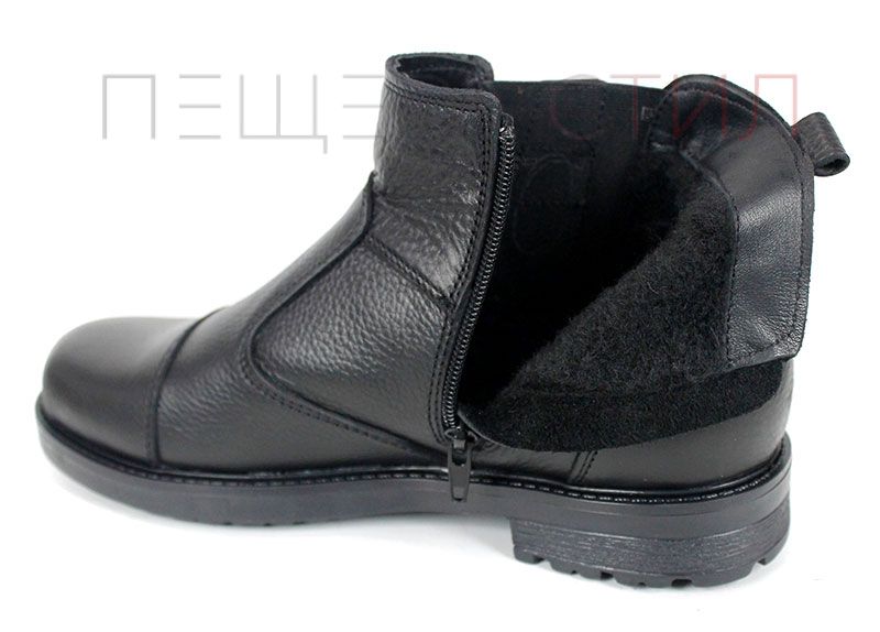 Мъжки спортно-елегантни боти Forte Passo от черна естествена кожа, с плътен топъл хастар тип „мече“. Моделът разполага с широк външен ластик за отлично прилягане и вътрешен цип за бързо обуване. Олекотено класическо ходило с нисък ток и зимен грайфер.
