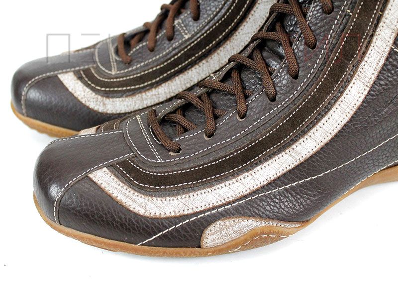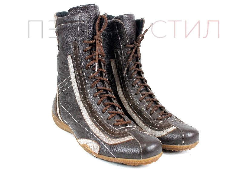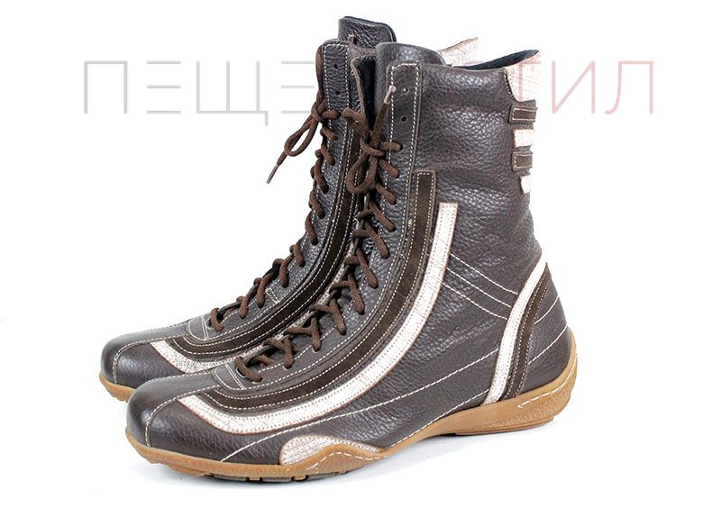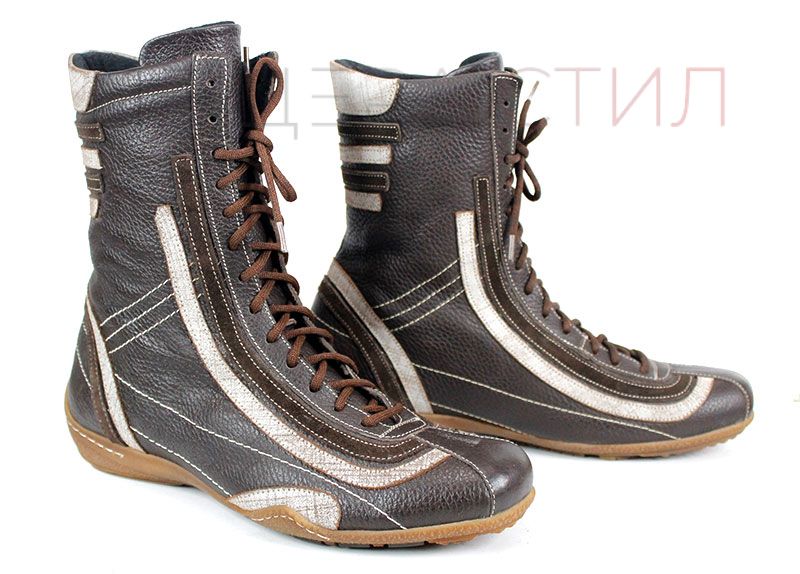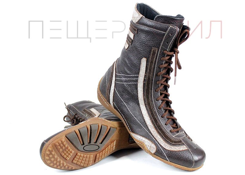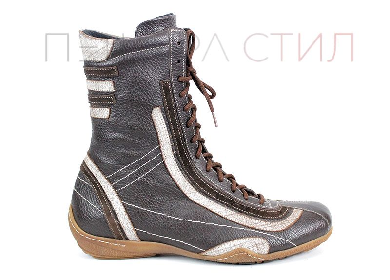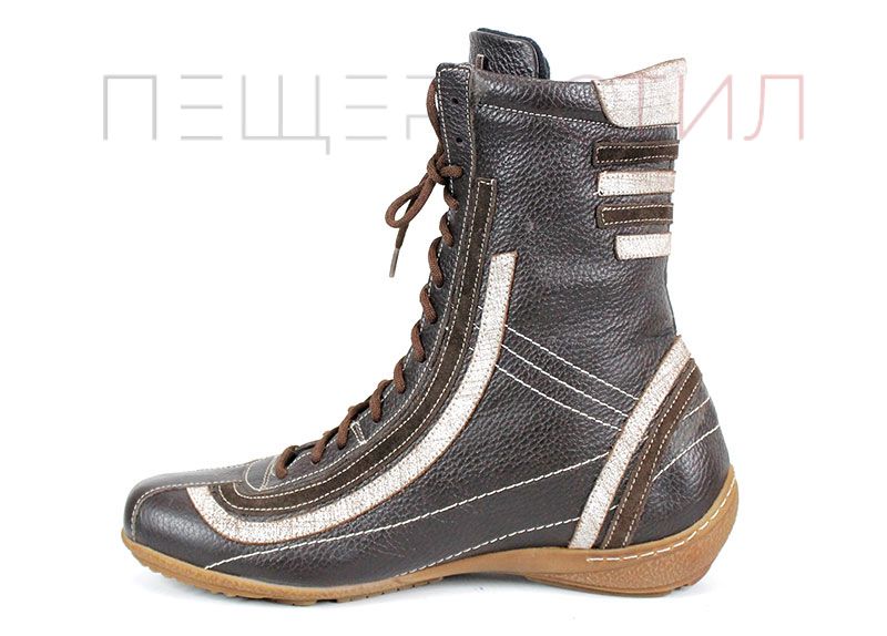 Преоценени дамски ежедневни боти изработени от естествена, мека кожа в кафяв цвят, на ниско ходило със зимен грайфер. Ботите са с връзки без страничен цип.