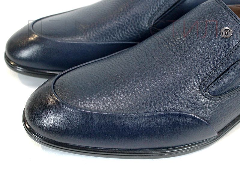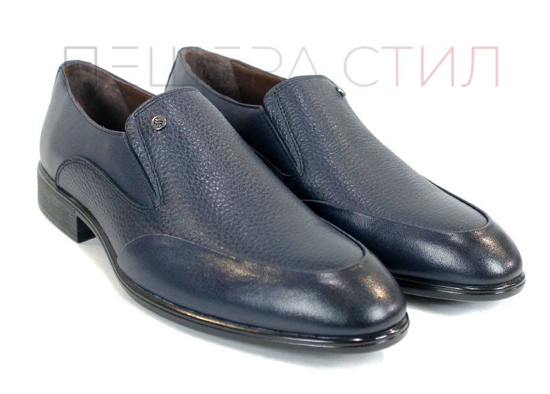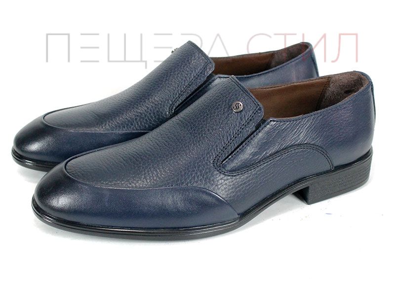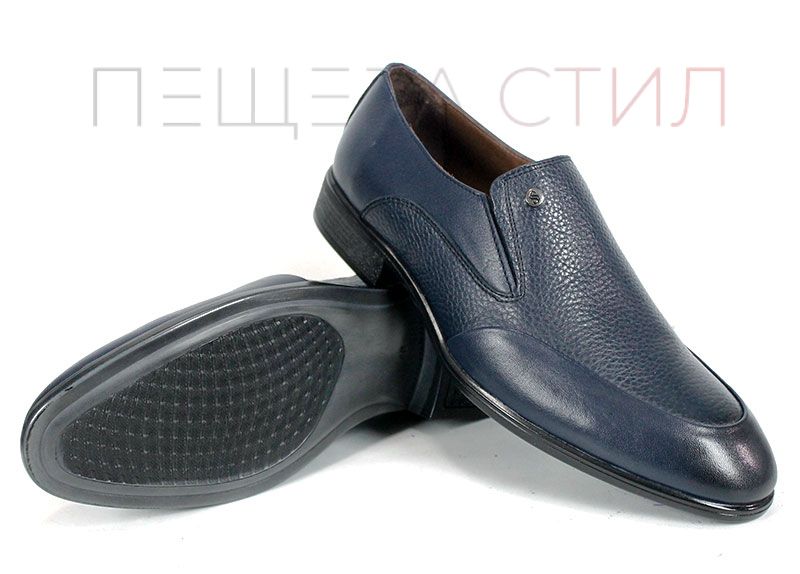 Мъжки официални обувки Aurelio Forma от естествена кожа в елегантен тъмно син цвят. Комбинация от гладка и шагрен кожа, удобен модел без връзки с два странични ластика, хастар и стелка от естествена кожа за комфорт през целия ден.
